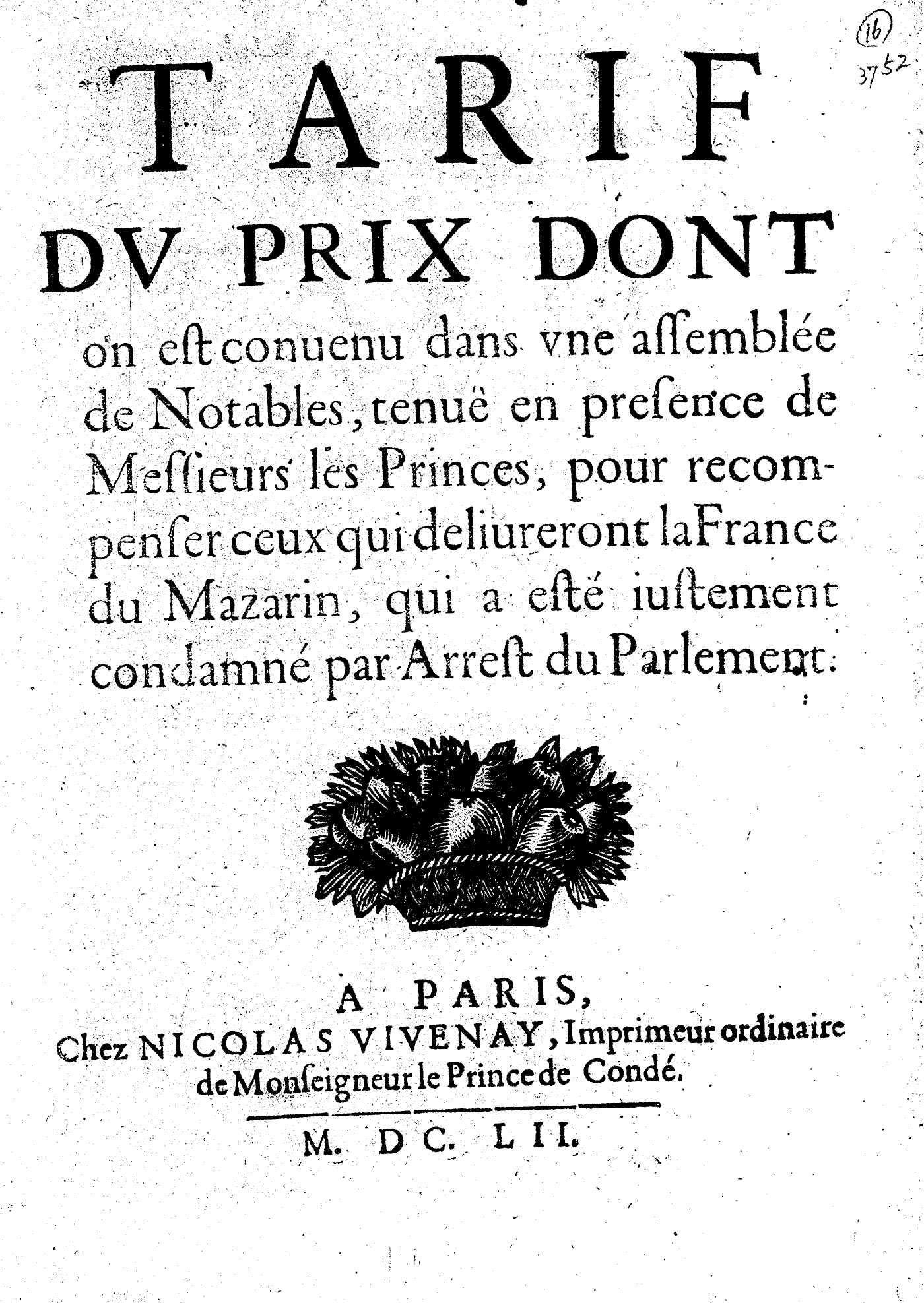 TARIF DV PRIX DONT on est conuenu dans vne assemblée de Notables, tenuë en presence de Messieurs les Princes, pour recompenser ceux qui deliureront la France du Mazarin, qui a esté iustement condamné par Arrest du Parlement.