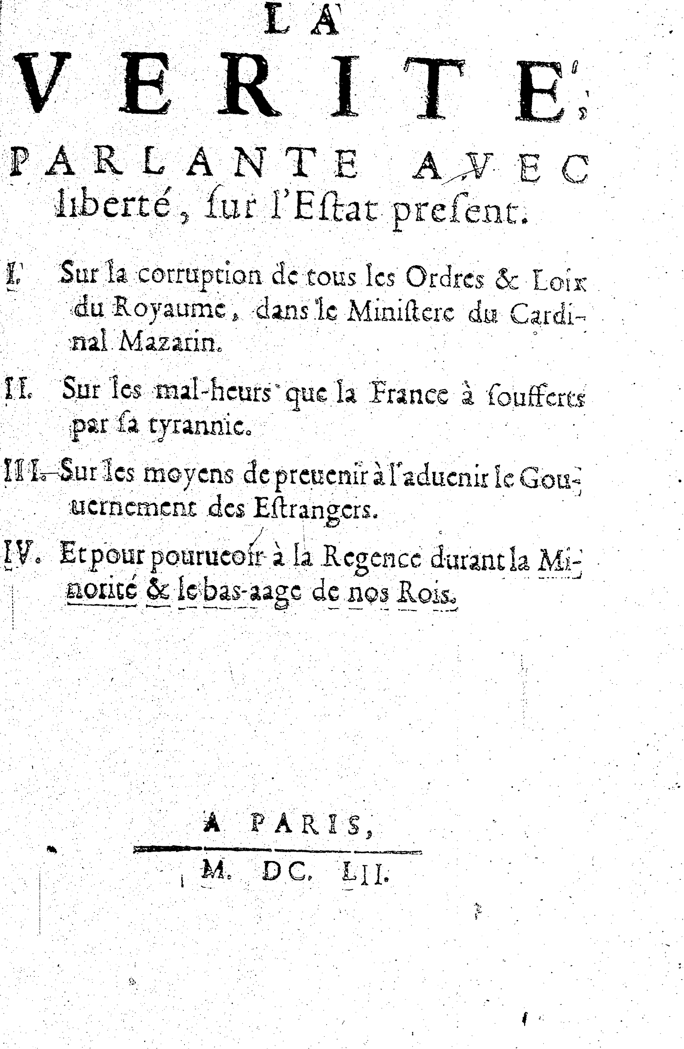 LA VERITÉ, PARLANTE AVEC liberté, sur l’Estat present. I. Sur la corruption de tous les Ordres & Loix du Royaume, dans le Ministere du Cardinal Mazarin. II. Sur les mal-heurs que la France à soufferts par sa tyrannie. III. Sur les moyens de preuenir à l’aduenir le Gouuernement des Estrangers. IV. Et pour pourueoir à la Regence durant la Minorité & le bas-aage de nos Rois.