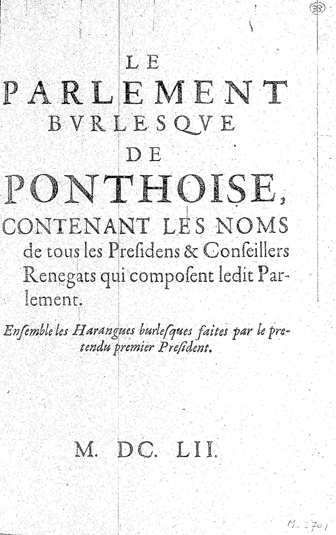 LE PARLEMENT BVRLESQVE DE PONTHOISE, CONTENANT LES NOMS de tous les Presidens & Conseillers Renegats qui composent ledit Parlement. Ensemble les Harangues burlesques faites par le pretendu premier President.