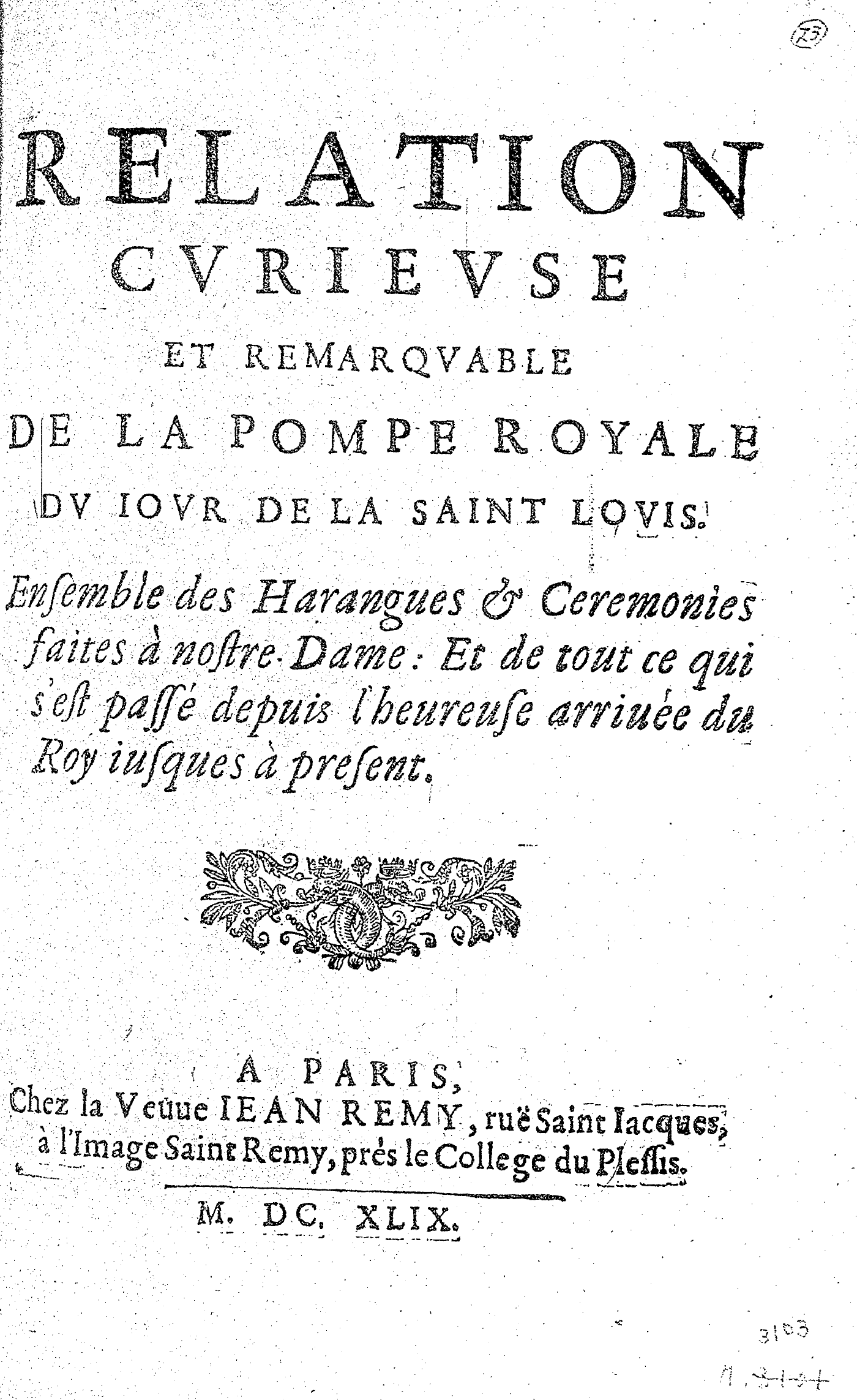 RELATION CVRIEVSE ET REMARQVABLE DE LA POMPE ROYALE DV IOVR DE LA SAINT LOVIS. Ensemble des Harangues & Ceremonies faites à nostre Dame : Et de tout ce qui s’est passé depuis l’heureuse arriuée du Roy iusques à present.