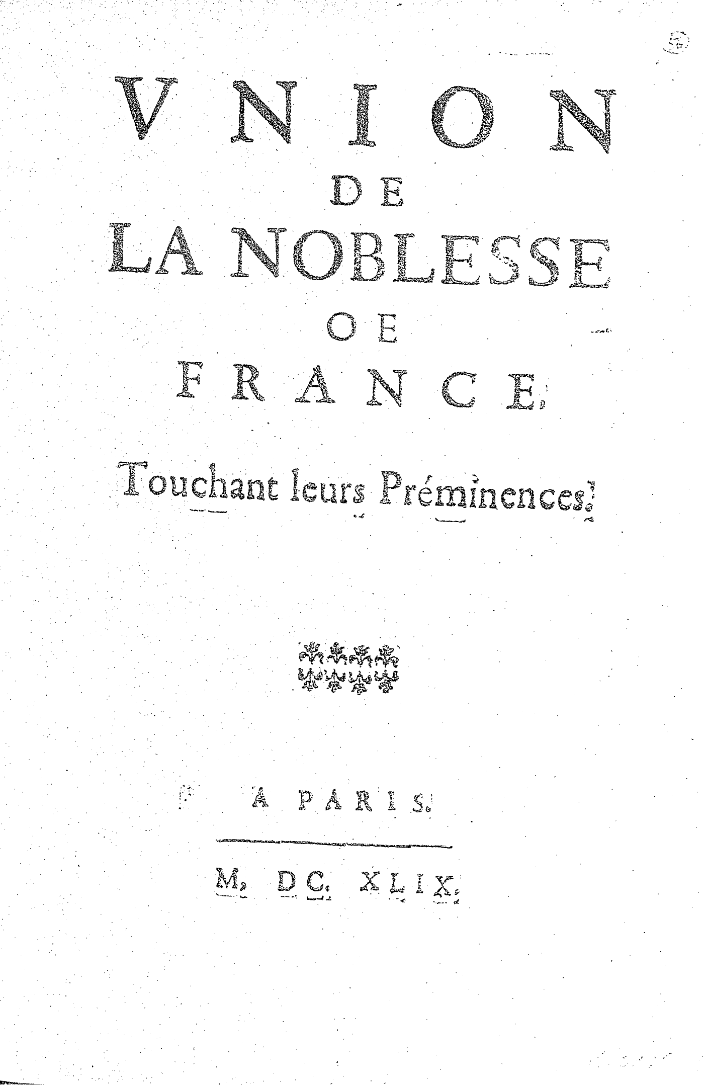 VNION DE LA NOBLESSE DE FRANCE, Touchant leurs Préminences.