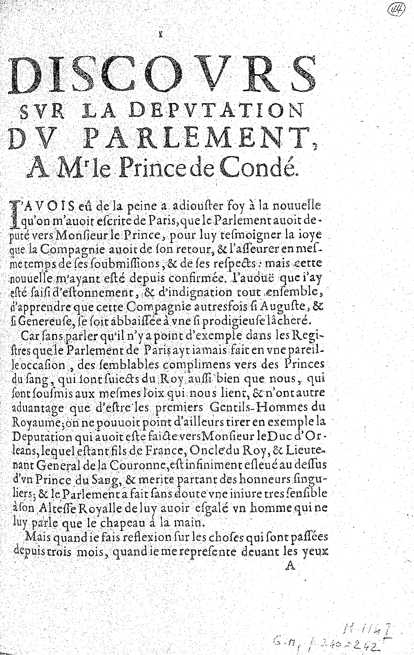 DISCOVRS SVR LA DEPVTATION DV PARLEMENT, A Mr le Prince de Condé.