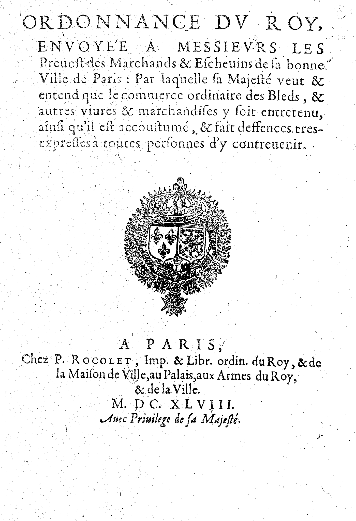 ORDONNANCE DV ROY, ENVOYÉE A MESSIEVRS LES Preuost des Marchands & Escheuins de sa bonne Ville de Paris : Par laquelle sa Majesté veut & entend que le commerce ordinaire des Bleds, & autres viures & marchandises y soit entretenu, ainsi qu’il est accoustumé, & fait deffences tres-expresses à toutes personnes d’y contreuenir.