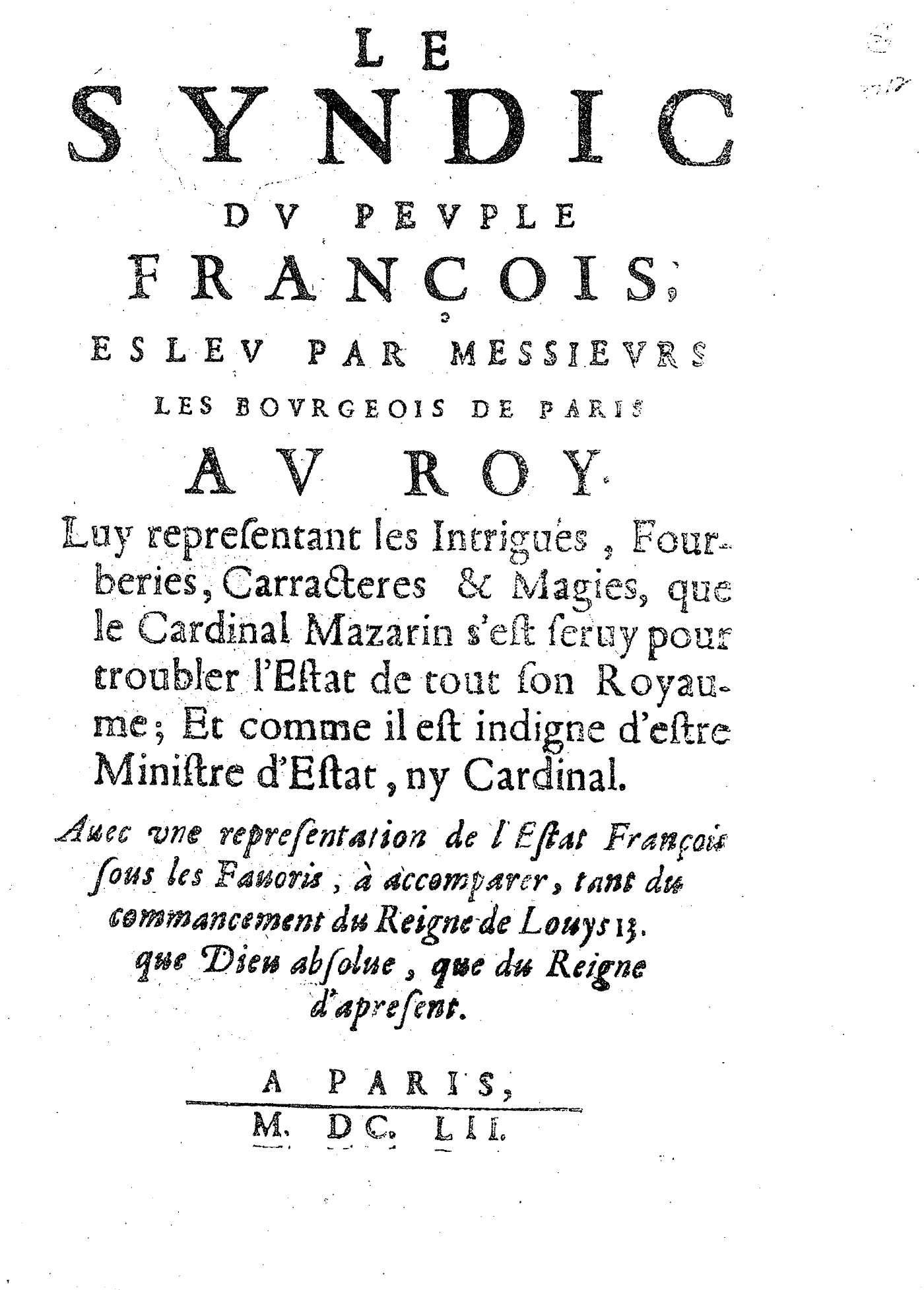 LE SYNDIC DV PEVPLE FRANÇOIS, ESLEV PAR MESSIEVRS LES BOVRGEOIS DE PARIS AV ROY. Luy representant les Intrigués, Fourberies, Carracteres & Magies, que le Cardinal Mazarin s’est seruy pour troubler l’Estat de tout son Royaume ; Et comme il est indigne d’estre Ministre d’Estat, ny Cardinal. Auec vne representation de l’Estat François sous les Fauoris, à accomparer, tant du commancement du Reigne de Louys 13. que Dieu absolue, que du Reigne d’apresent.