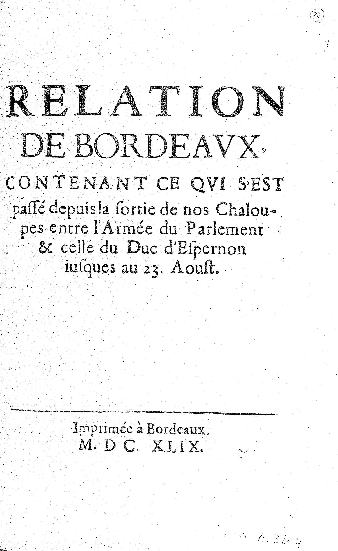 RELATION DE BORDEAVX, CONTENANT CE QVI S’EST passé depuis la sortie de nos Chaloupes entre l’Armée du Parlement & celle du Duc d’Espernon iusques au 23. Aoust.