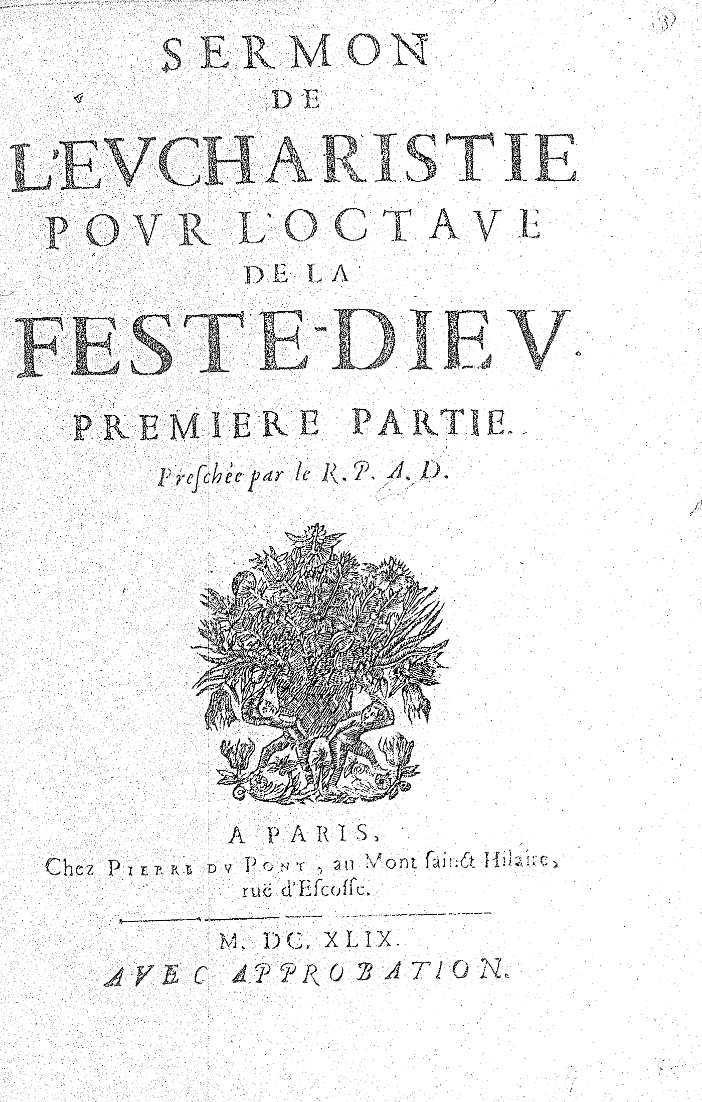 SERMON DE L’EVCHARISTIE POVR L’OCTAVE DE LA FESTE-DIEV. PREMIERE PARTIE. Preschée par le R. P. A. D.
