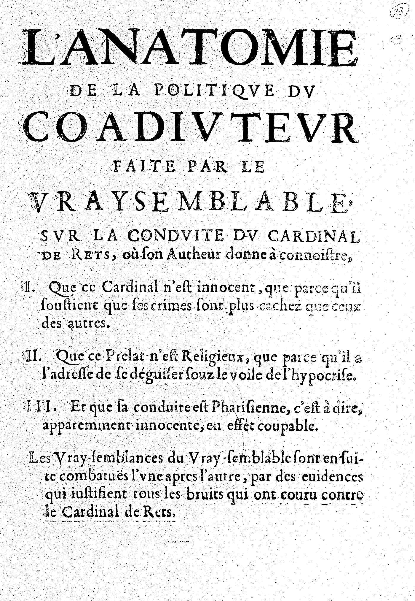 L’ANATOMIE DE LA POLITIQVE DV COADIVTEVR FAITE PAR LE VRAYSEMBLABLE SVR LA CONDVITE DV CARDINAL DE RETS, où son Autheur donne à connoistre, I. Que ce Cardinal n’est innocent, que parce qu’il soustient que ses crimes sont plus cachez que ceux