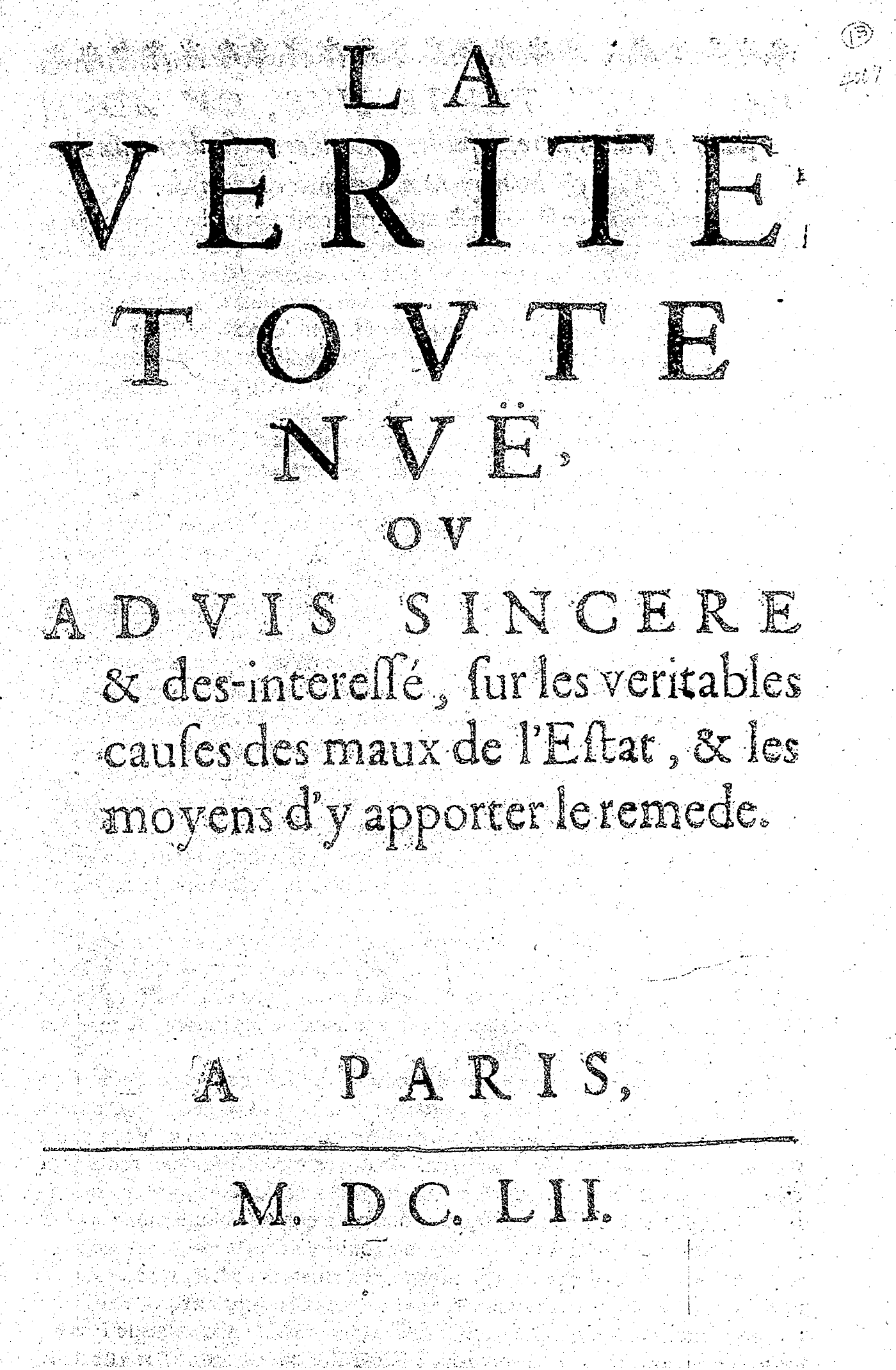 Carrier ajoute : "il est certain que ce n'est pas Arnauld d'Andilly qui a donné à imprimer "La vérité toute nue" : nous savons précisément, au contraire, que le solitaire en faisait distribuer des copies manuscrites à ses amis et relations par son propre fils, que cette diffusion confidentielle se prolongea pendant tout le mois de juillet 1652, et que c'est seulement au début d'août que, par hasard ou à dessein, une copie finit par arriver entre les mains d'un imprimeur." ("Les hommes du livre", p. 173)