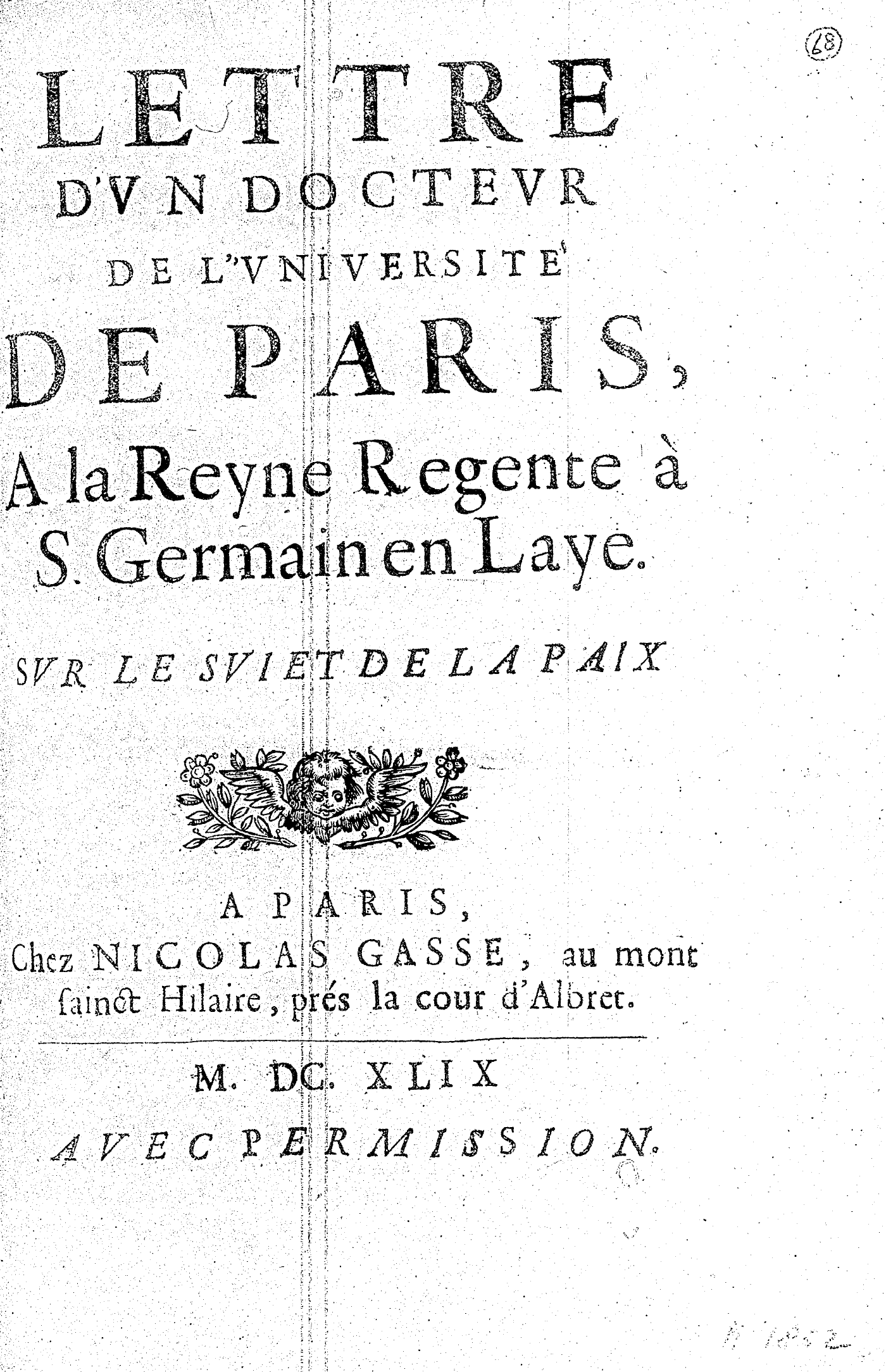 LETTRE D’VN DOCTEVR DE L’VNIVERSITÉ DE PARIS, A la Reyne Regente à S. Germain en Laye. SVR LE SVIET DE LA PAIX