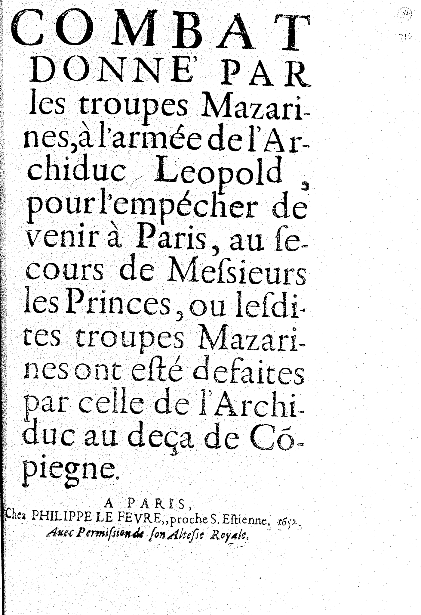 COMBAT DONNÉ PAR les troupes Mazarines, à l’armée de l’Archiduc Leopold, pour l’empécher de venir à Paris, au secours de Messieurs les Princes, ou lesdites troupes Mazarines ont esté defaites par celle de l’Archiduc au deça de Cõpiegne.
