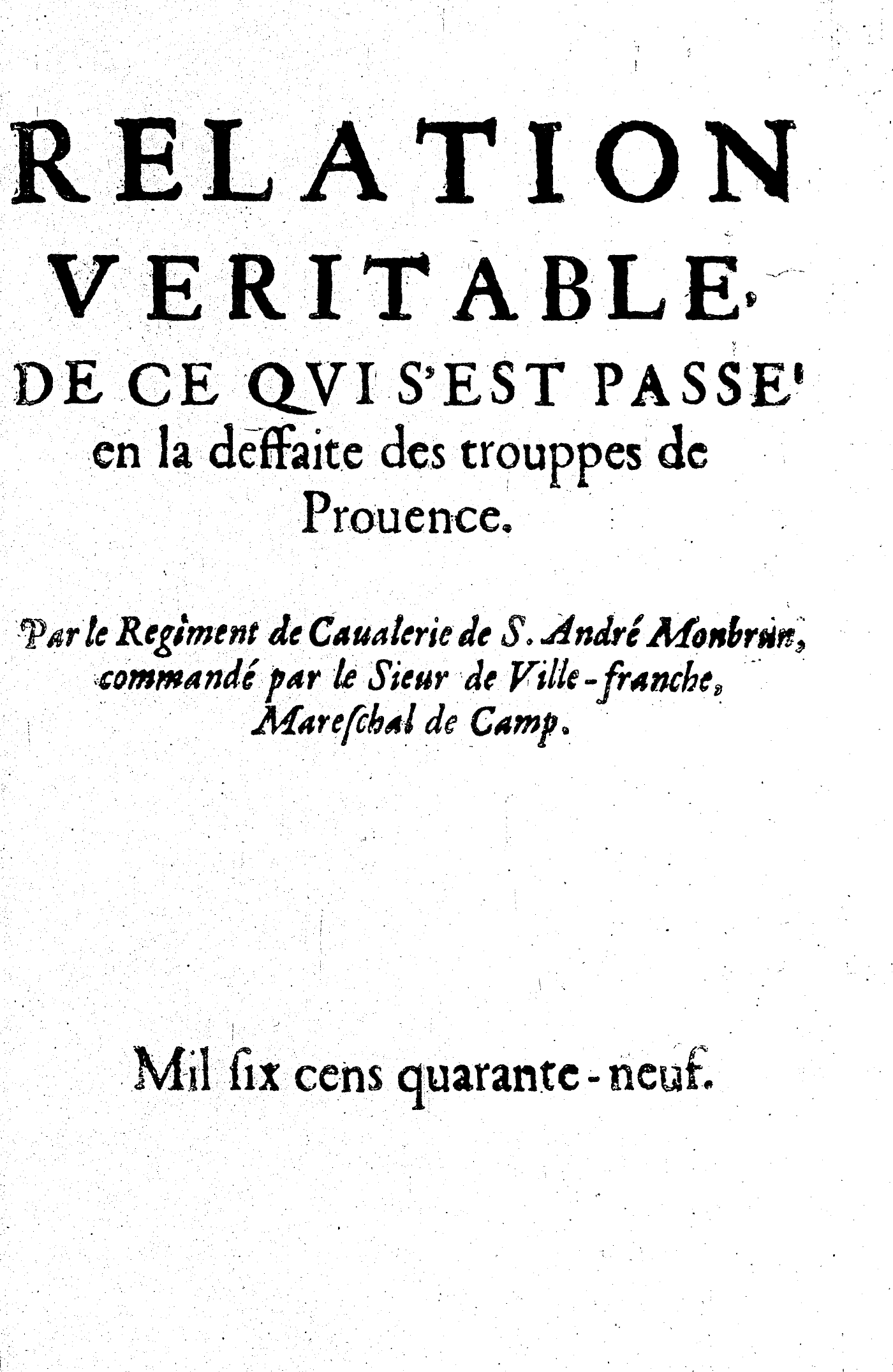 RELATION VERITABLE, DE CE QVI S’EST PASSÉ en la deffaite des trouppes de Prouence. Par le Regiment de Caualerie de S. André Monbrun, commandé par le Sieur de Ville-franche, Mareschal de Camp.