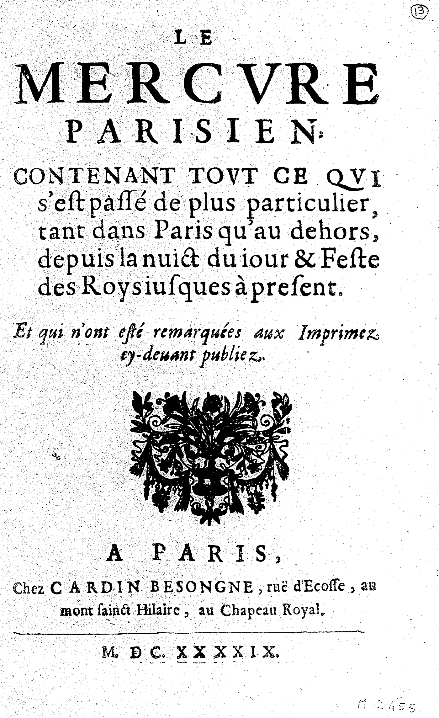 LE MERCVRE PARISIEN, CONTENANT TOVT CE QVI