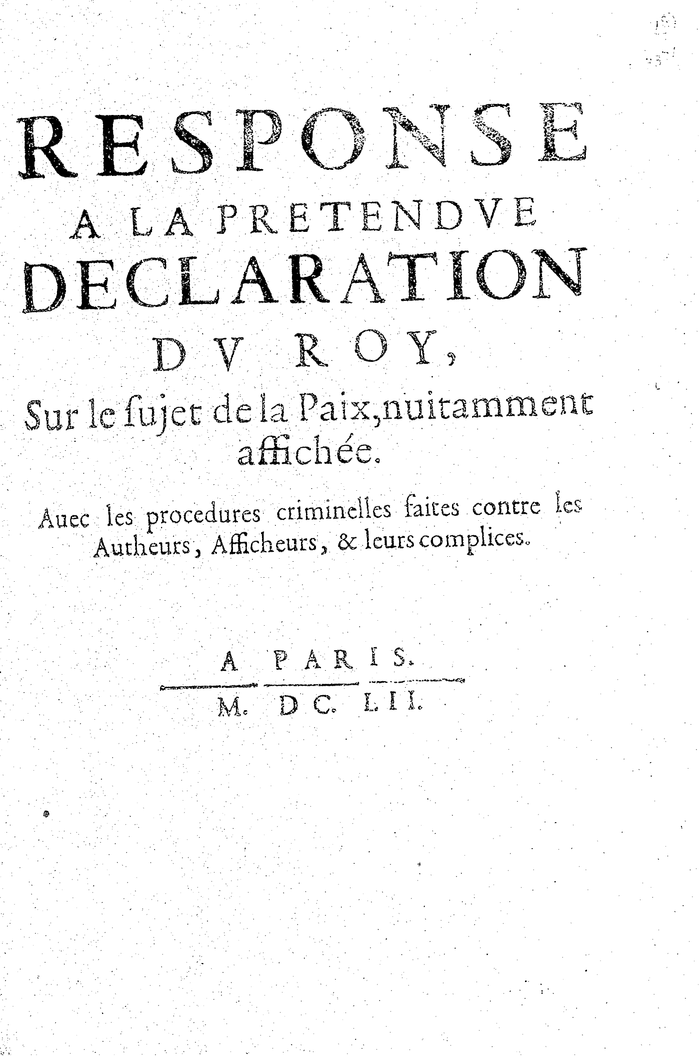 RESPONSE A LA PRETENDVE DECLARATION DV ROY, Sur le sujet de la Paix, nuitamment affichée. Auec les procedures criminelles faites contre les Autheurs, Afficheurs, & leurs complices.