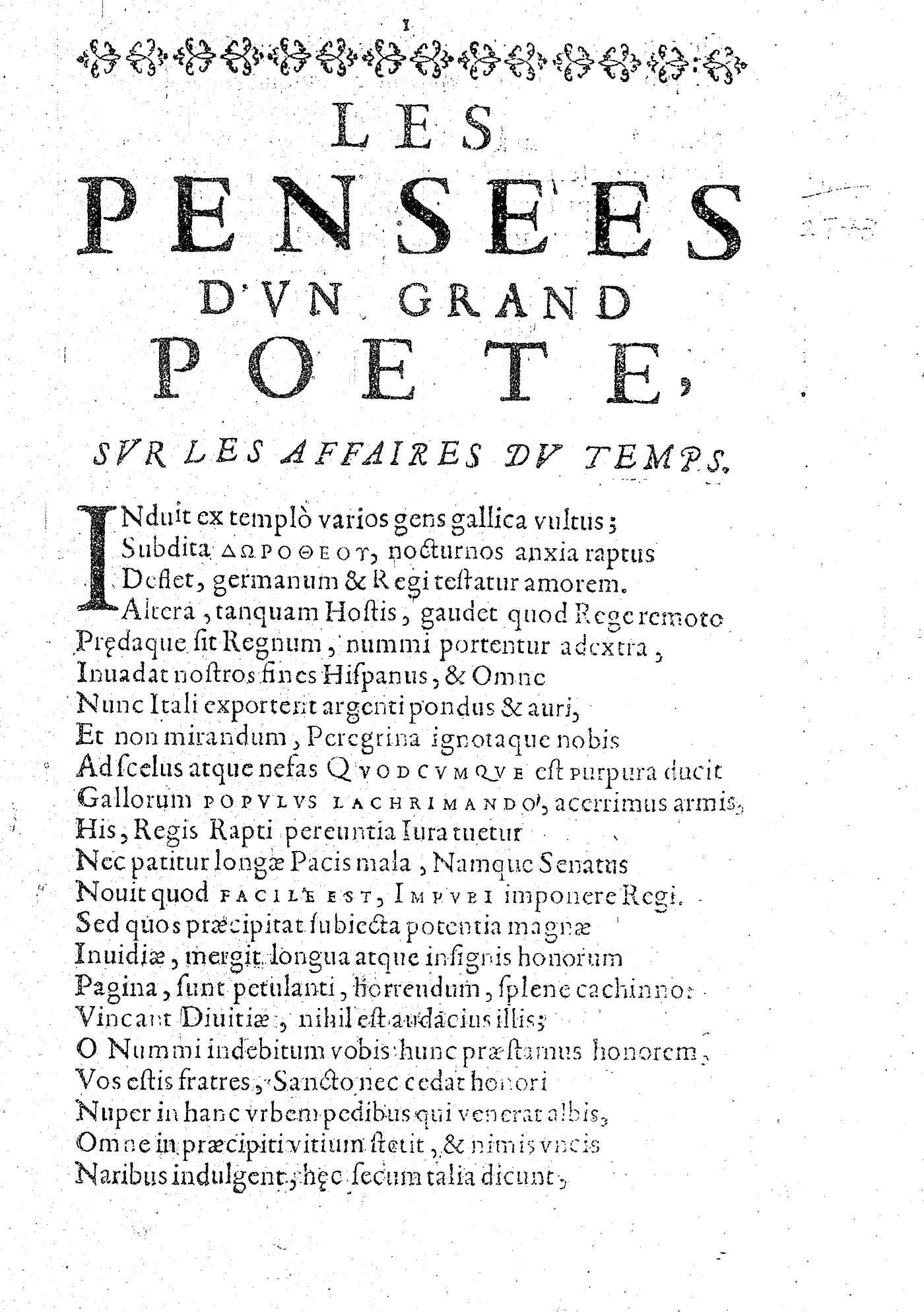 LES PENSÉES D’VN GRAND POETE, SVR LES AFFAIRES DV TEMPS.