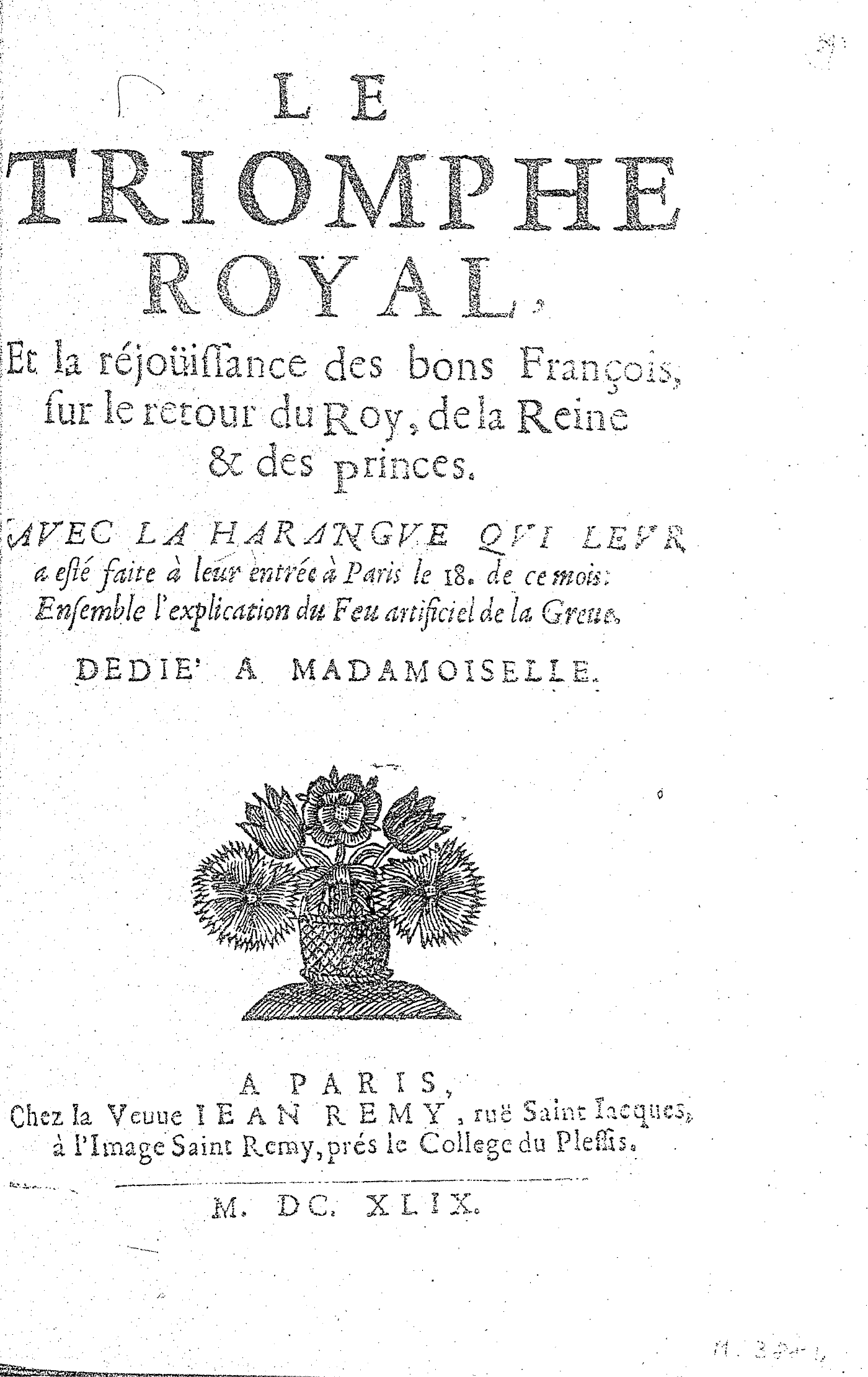 LE TRIOMPHE ROYAL, Et la réjoüissance des bons François, sur le retour du Roy, de la Reine & des princes. AVEC LA HARANGVE QVI LEVR a esté faite à leur entrée à Paris le 18. de ce mois : Ensemble l’explication du Feu artificiel de la Greue. DEDIÉ A MADAMOISELLE.