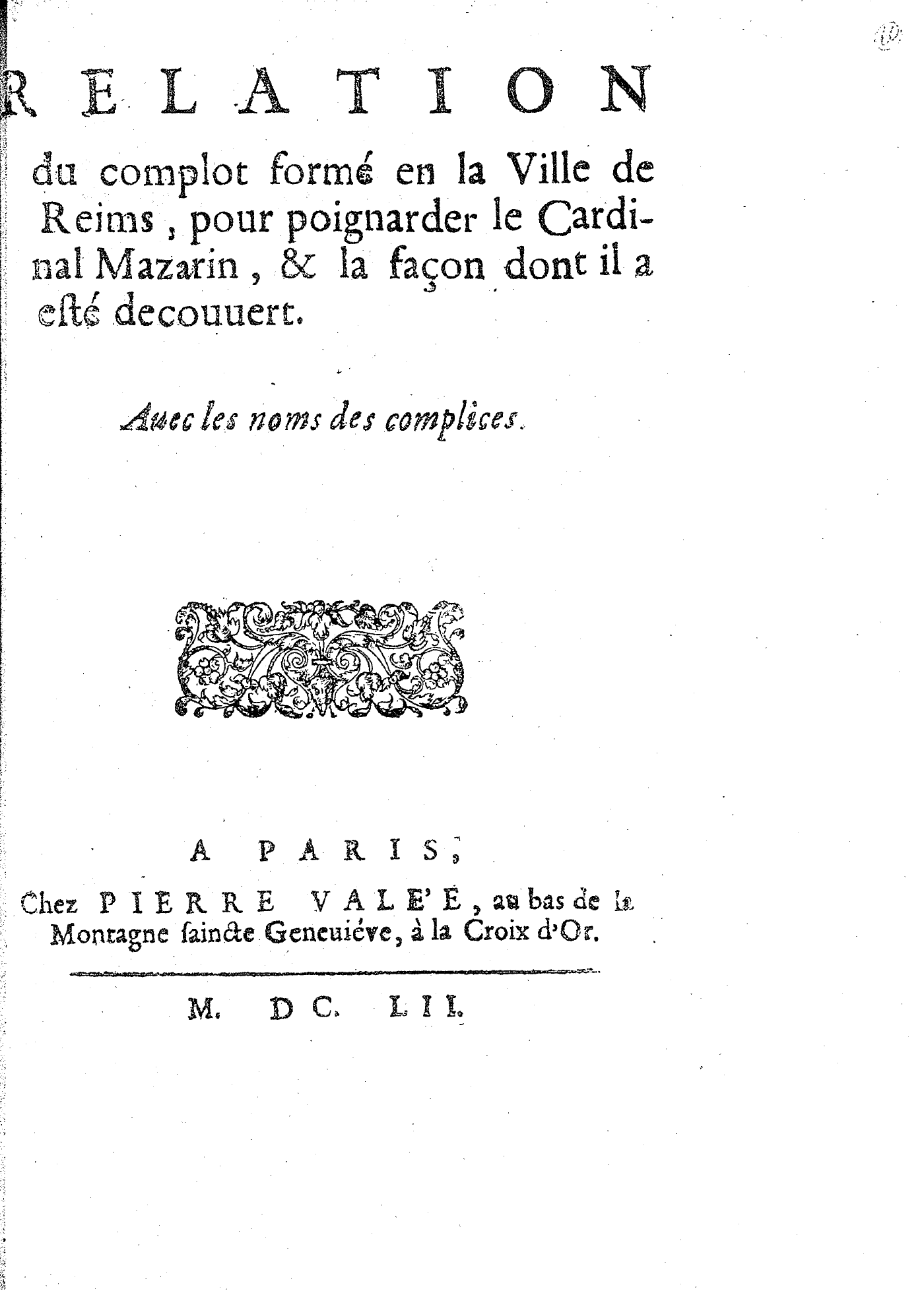 RELATION du complot formé en la Ville de Reims, pour poignarder le Cardinal Mazarin, & la façon dont il a esté decouuert. Auec les noms des complices.