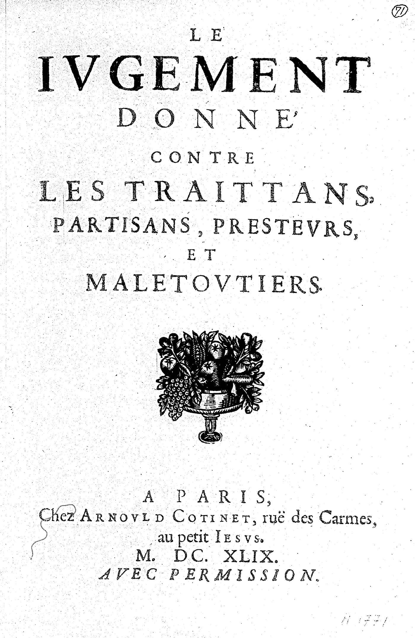LE IVGEMENT DONNÉ CONTRE LES TRAITTANS, PARTISANS, PRESTEVRS, ET MALETOVTIERS.