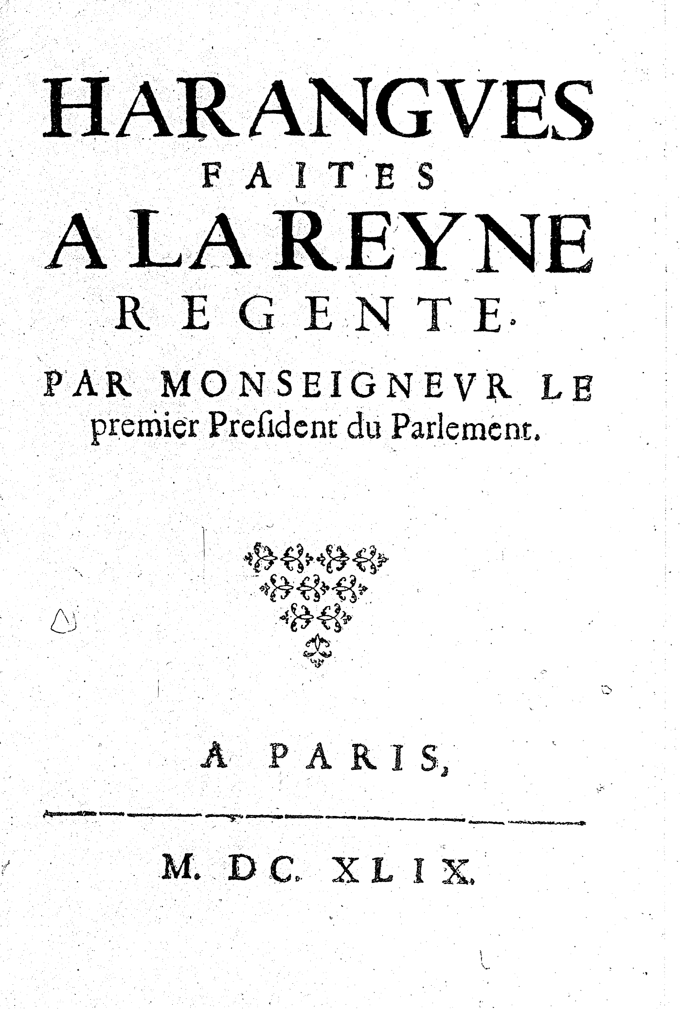 HARANGVES FAITES A LA REYNE REGENTE. PAR MONSEIGNEVR LE premier President du Parlement.