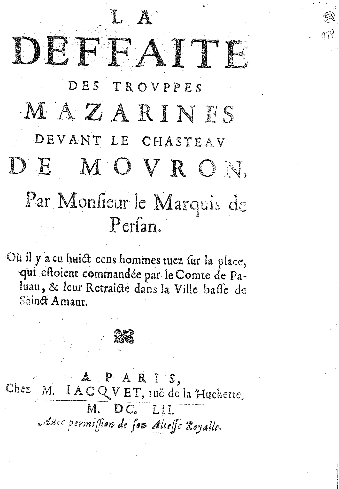 LA DEFFAITE DES TROVPPES MAZARINES DEVANT LE CHASTEAV DE MOVRON, Par Monsieur le Marquis de Persan. Où il y a eu huict cens homes tuez sur la place, qui estoient commandée par le Comte de Paluau, & leur Retraicte dans la Ville basse de Sainct Amant.