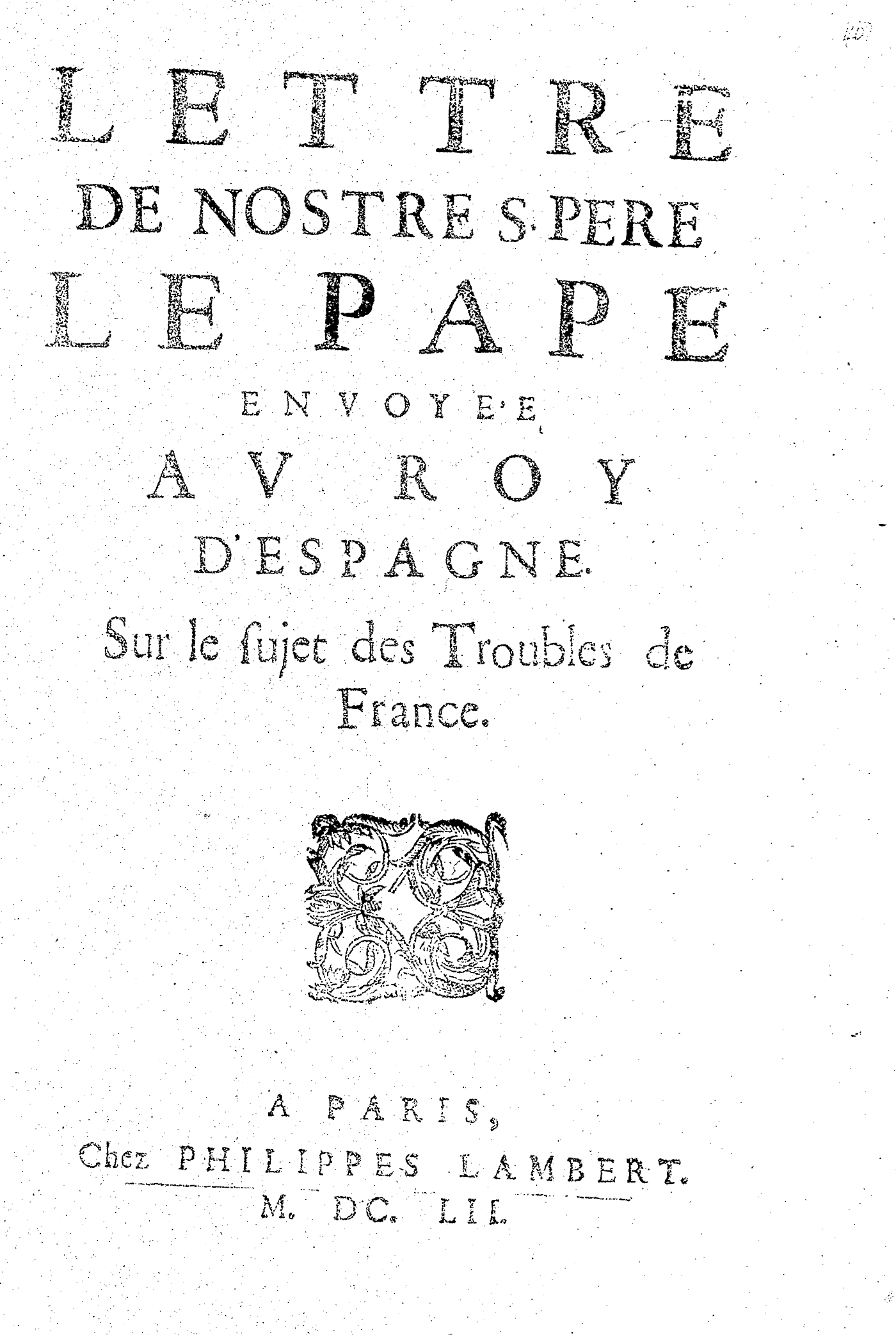 LETTRE DE NOSTRE S. PERE LE PAPE ENVOYÉE AV ROY D’ESPAGNE. Sur le sujet des Troubles de France.