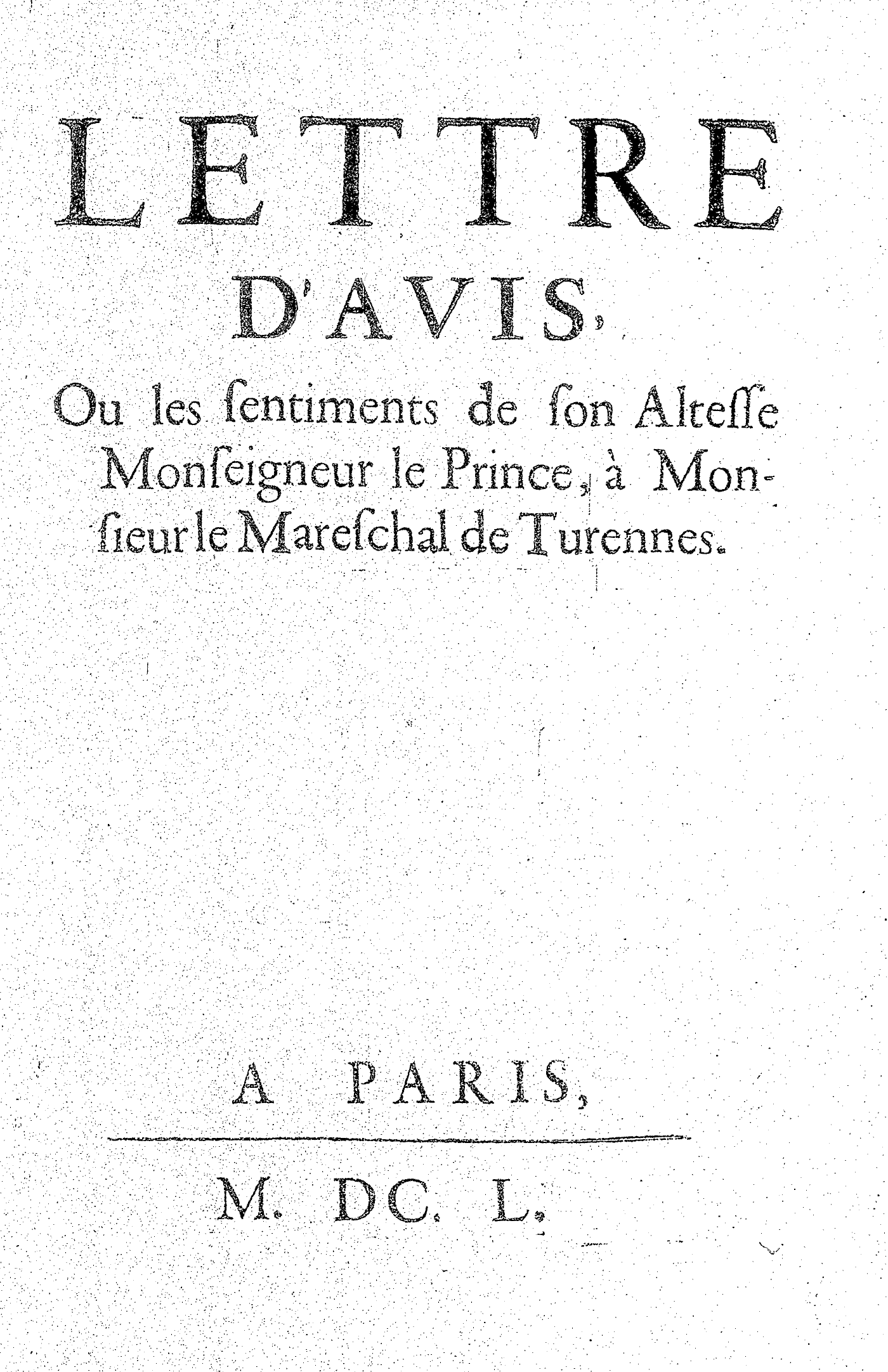 LETTRE D’AVIS, Ou les sentiments de son Altesse Monseigneur le Prince, à Monsieur le Mareschal de Turennes.