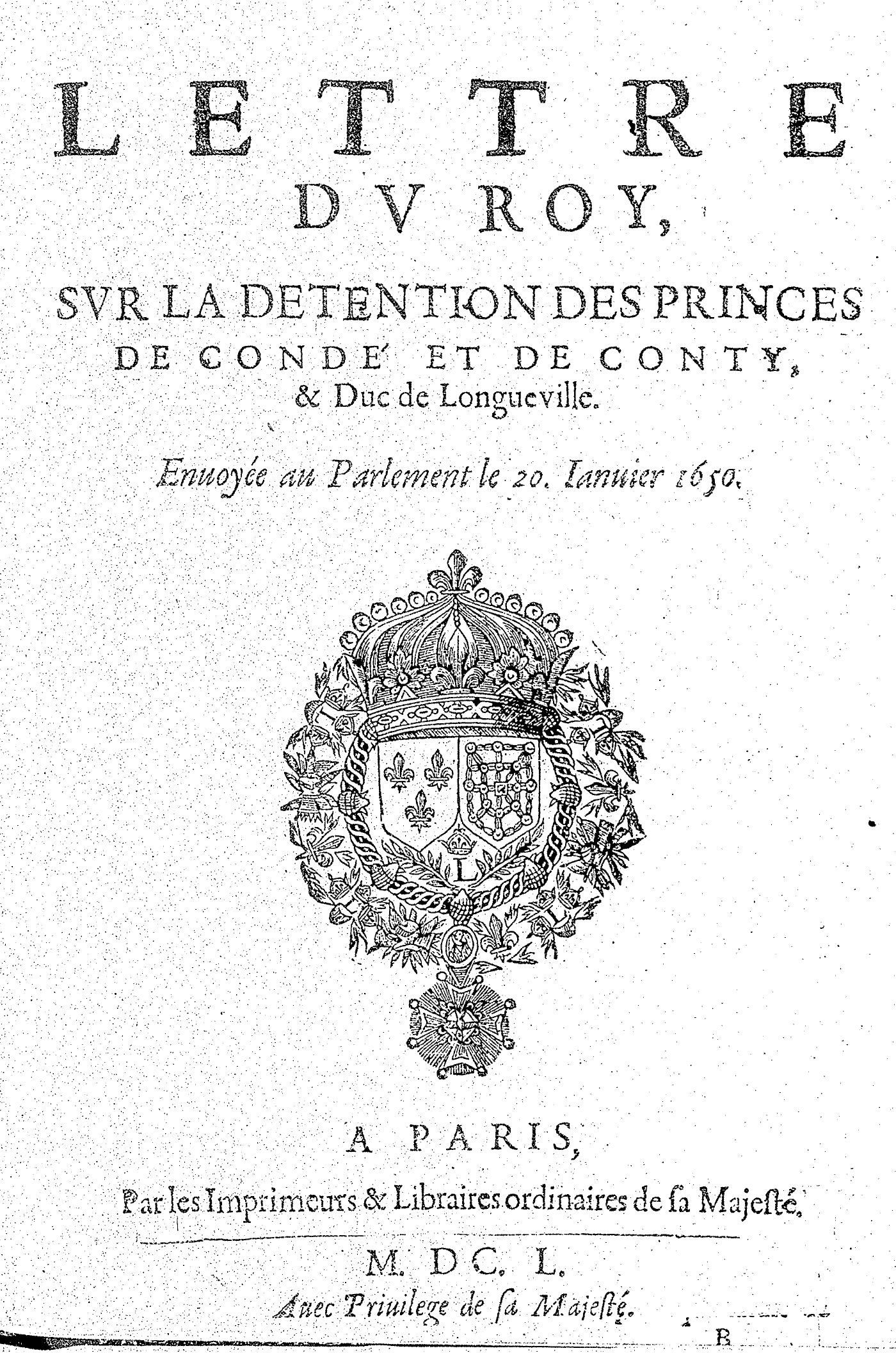 La lettre est reproduite en entier dans les "Mémoires pour servir à l'histoire de Louis de Bourbon, prince de Condé" (par de La Brune), Ier vol., page 369. Enfin, il y en a une seconde édition des imprimeurs et libraires ordinaires du roi, sur le titre de laquelle, après ces mots : "envoyée au Parlement, le 20 janvier", on a ajouté ceux-ci : "Chambre des comptes, cour des Aydes, le 21 dudict mois de janvier 1650". Elle est également de vingt pages. Un anonyme l'a traduite en italien et publiée à Milan dès 1650. On la trouve indiquée sous le n°715 du catalogue des livres de M. Ferd. Belvisi de Bologne, avec le titre de : "Lettera del re mandata al parliamento di Parigi", etc.