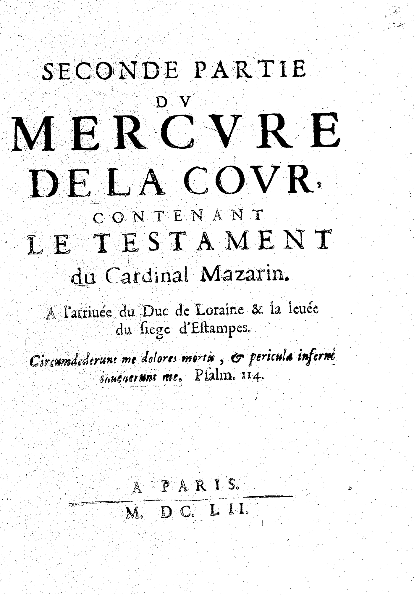 SECONDE PARTIE DV MERCVRE DE LA COVR, CONTENANT LE TESTAMENT du Cardinal Mazarin. A l’arriuée du Duc de Loraine & la leuée du siege d’Estampes. Circumdederunt me dolores mortis, & periculæ inferm inuenerunt me.