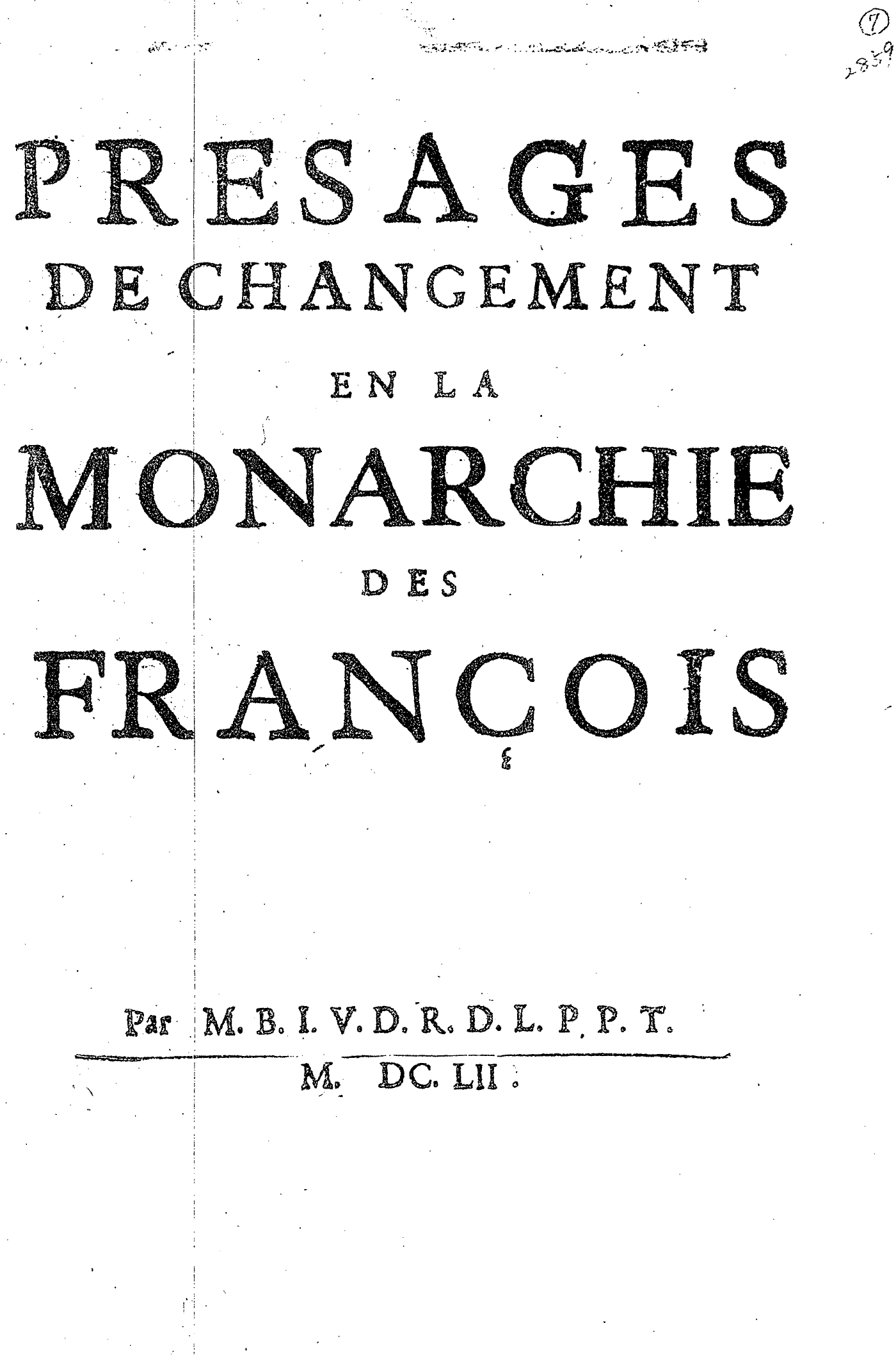 Ce libelle a été écrit en 1650. Dans un passage, en effet, l'auteur dit : « La précédente année 1649... » et ailleurs : « Il semble que ce bon génie de la France a fait écrire aux "Remèdes des malheurs de l'État", imprimés depuis un an... » Et les "Remèdes des malheurs de l’État" [M0_3270] sont de 1649. Je n'ai pas vu d'édition de 1650 ; et peut-être les "Présages" ont-ils circulé manuscrits jusqu'en 1652.
