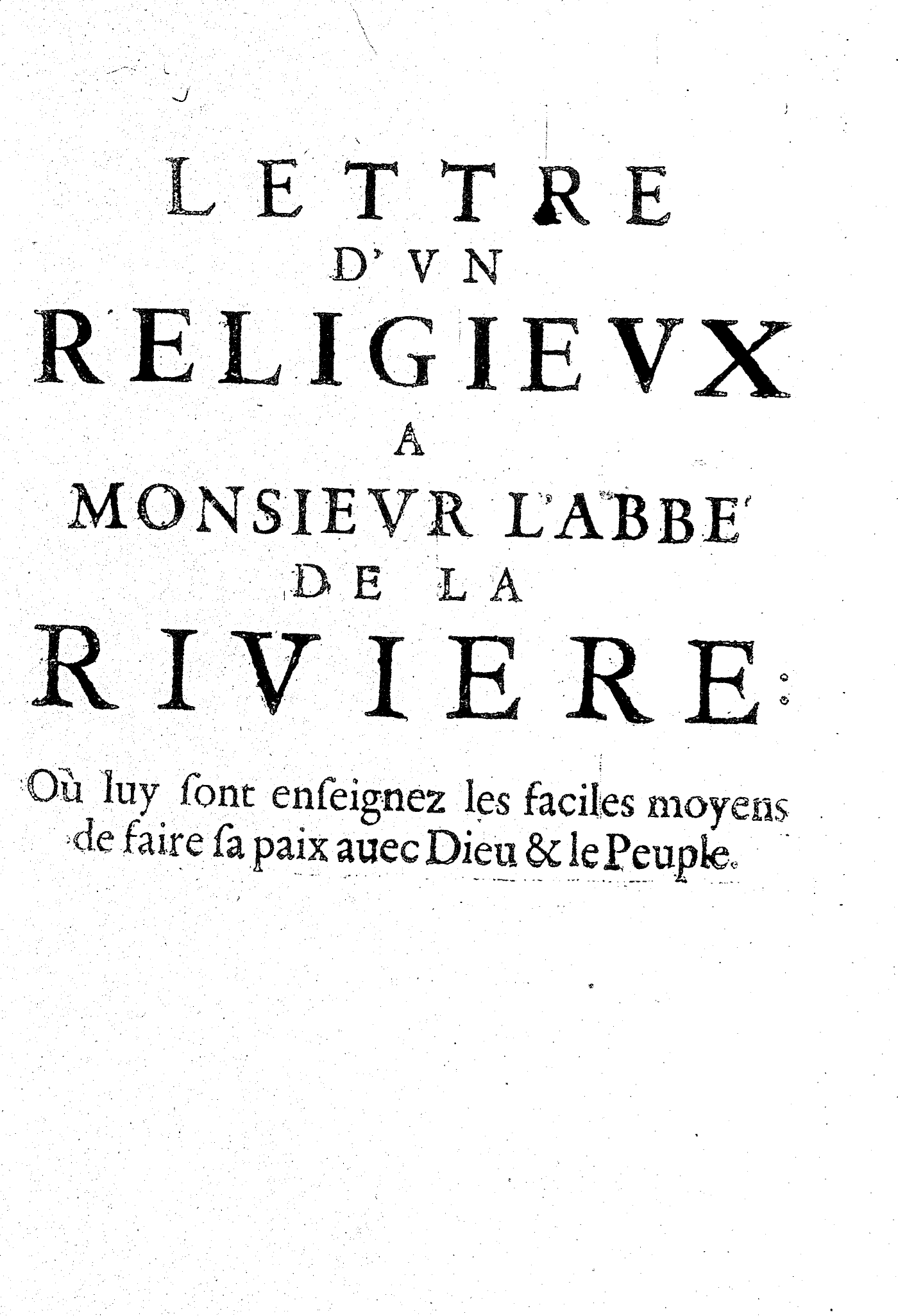 LETTRE D’VN RELIGIEVX A MONSIEVR L’ABBÉ DE LA RIVIERE : Où luy sont enseignez les faciles moyens de faire sa paix auec Dieu & le Peuple.