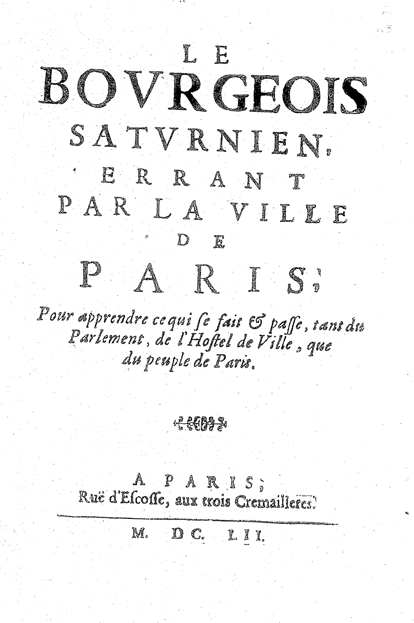 LE BOVRGEOIS SATVRNIEN, ERRANT PAR LA VILLE DE PARIS, Pour apprendre ce qui se fait & passe, tant du Parlement, de l’Hostel de Ville, que du peuple de Paris.