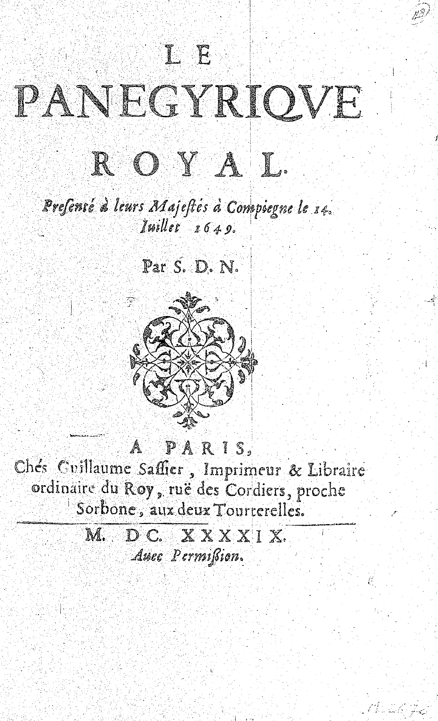 LE PANEGYRIQVE ROYAL. Presenté à leurs Majestés à Compiegne le 14. Iuillet 1649. Par S. D. N.
