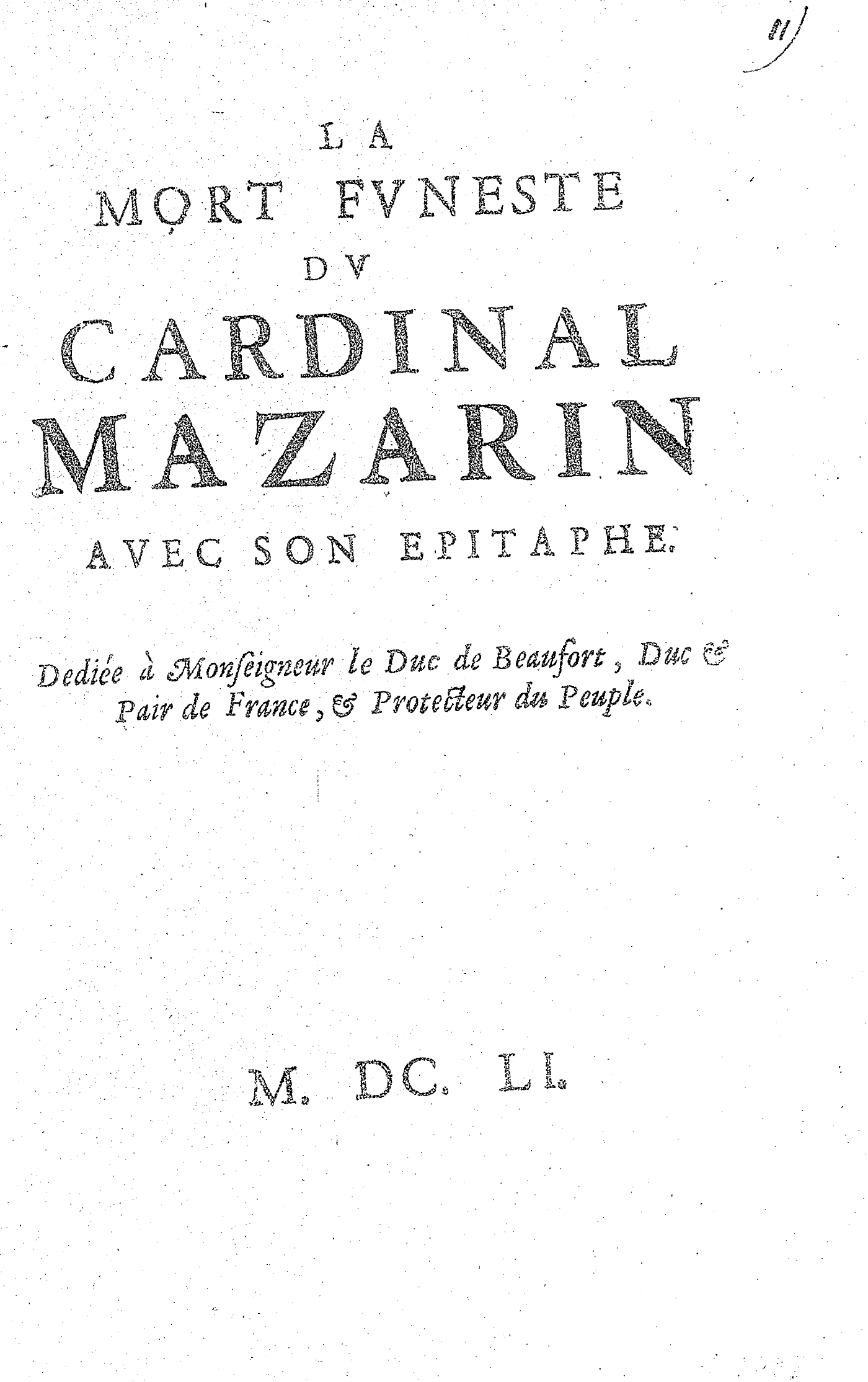 LA MORT FVNESTE DV CARDINAL MAZARIN AVEC SON EPITAPHE. Dediée à Monseigneur le Duc de Beaufort, Duc & Pair de France, & Protecteur du Peuple.