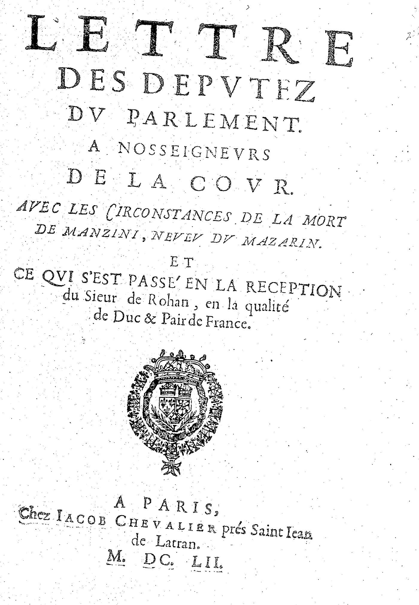 LETTRE DES DEPVTEZ DV PARLEMENT. A NOSSEIGNEVRS DE LA COVR. AVEC LES CIRCONSTANCES DE LA MORT DE MANZINI, NEVEV DV MAZARIN. ET CE QVI S’EST PASSÉ EN LA RECEPTION du Sieur de Rohan, en la qualité de Duc & Pair de France.