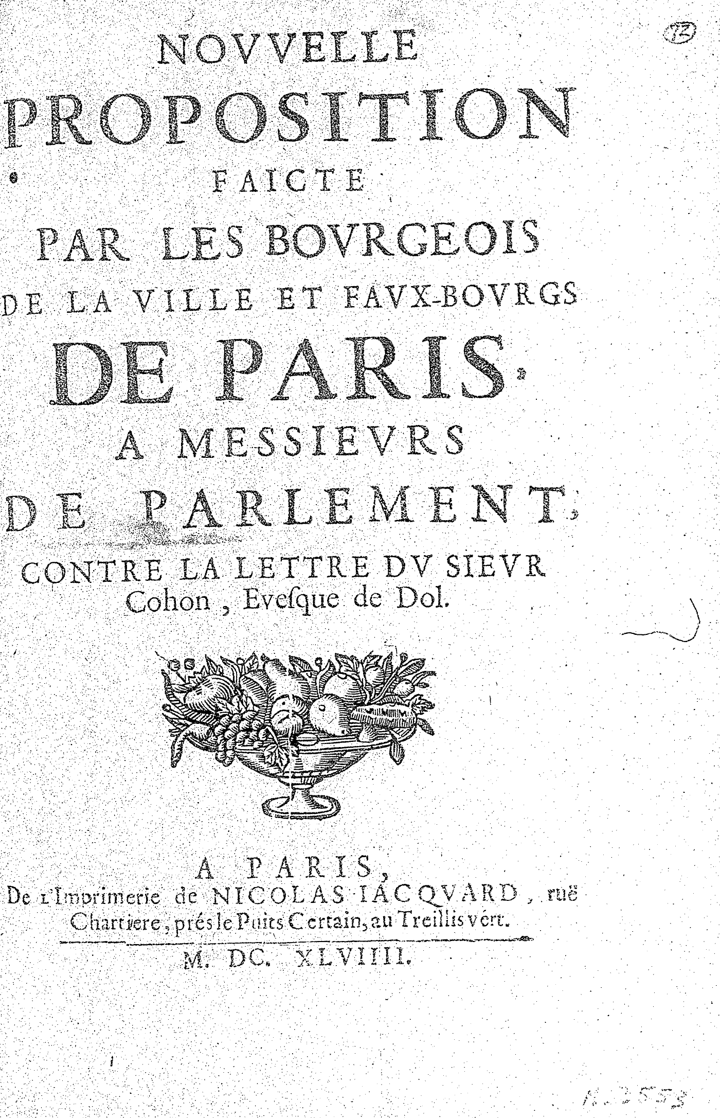 NOVVELLE PROPOSITION FAICTE PAR LES BOVRGEOIS DE LA VILLE ET FAVX-BOVRGS DE PARIS, A MESSIEVRS DE PARLEMENT, CONTRE LA LETTRE DV SIEVR Cohon, Evesque de Dol.