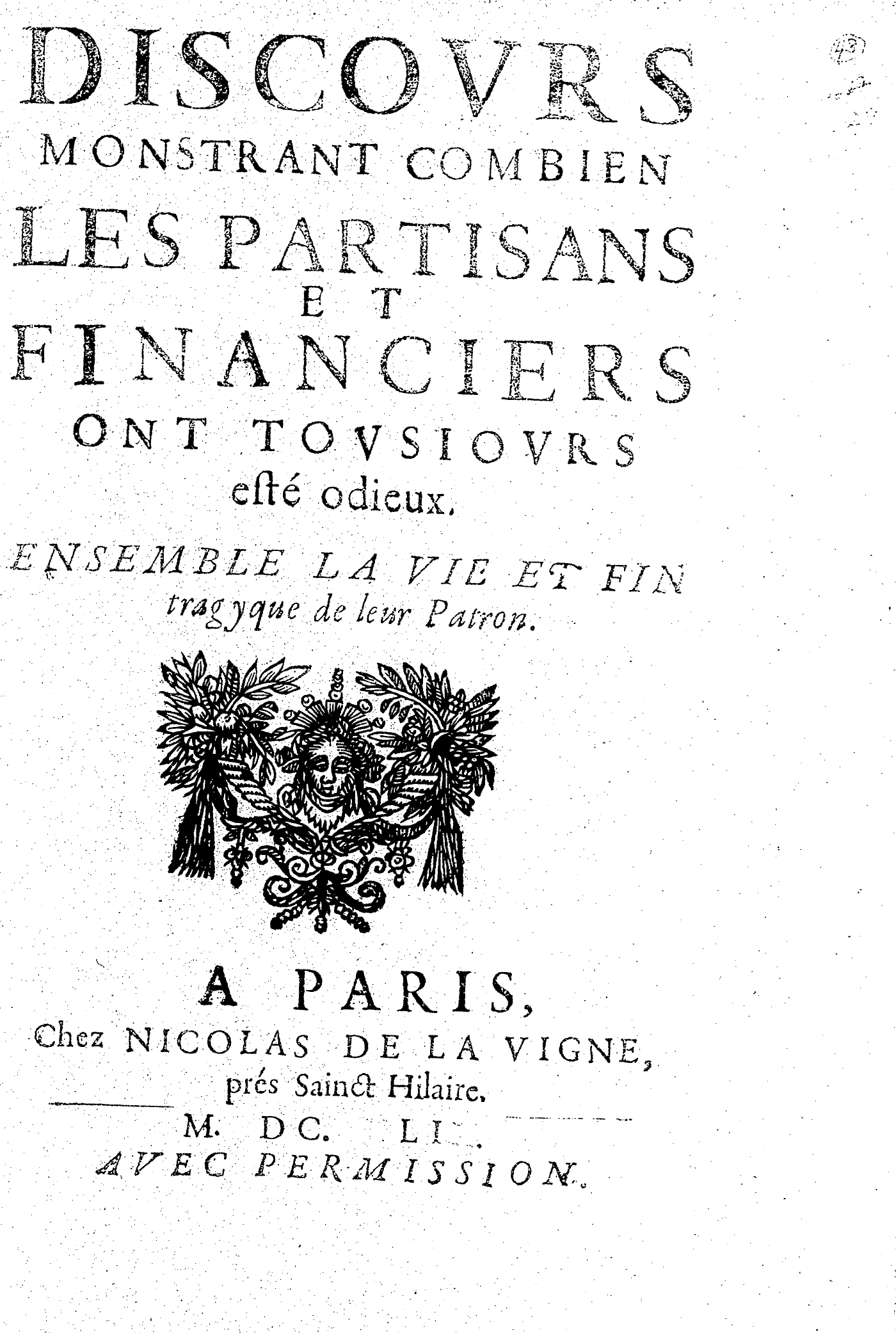 DISCOVRS MONSTRANT COMBIEN LES PARTISANS ET FINANCIERS ONT TOVSIOVRS esté odieux. ENSEMBLE LA VIE ET FIN tragyque de leur Patron.