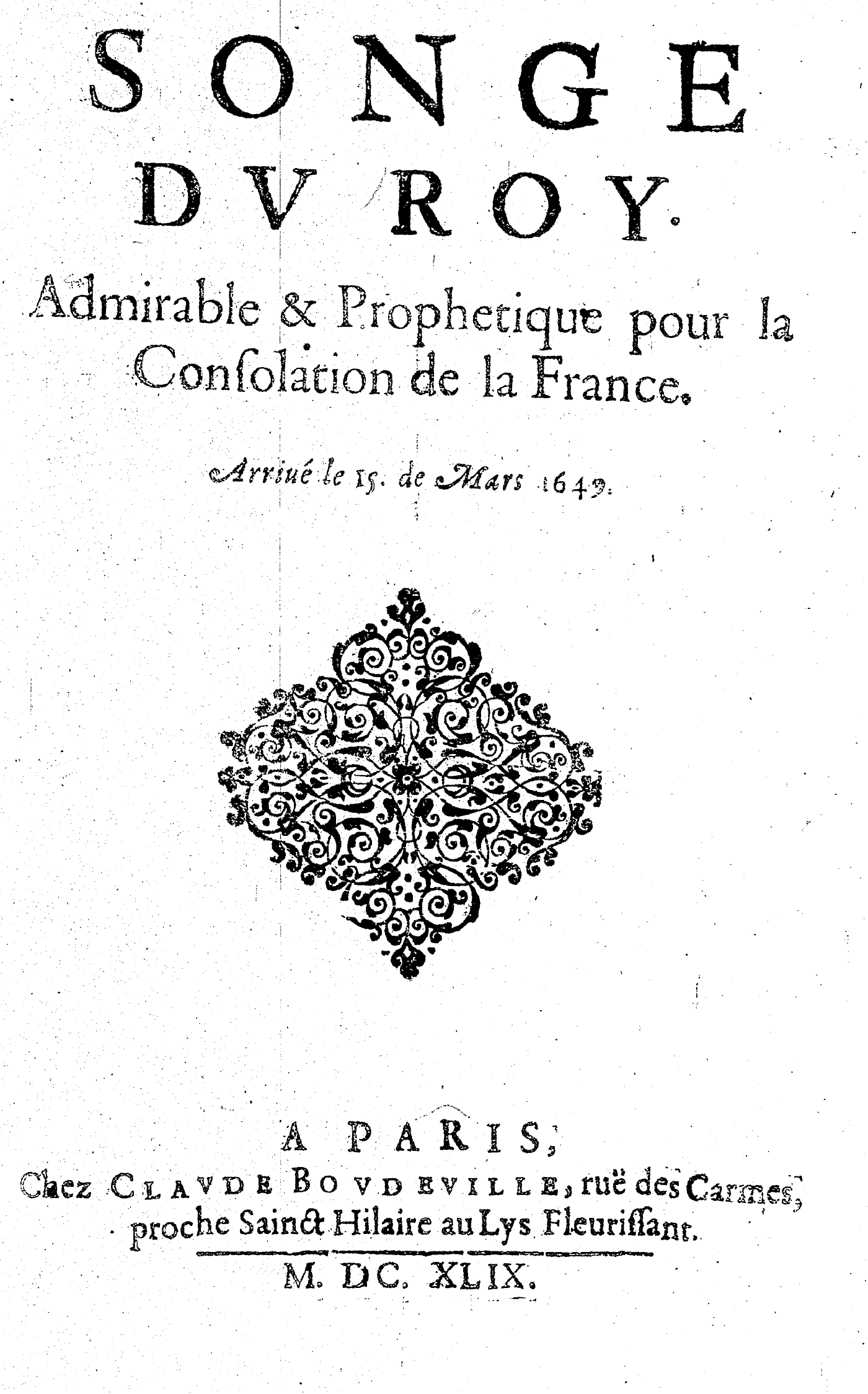 SONGE DV ROY. Admirable & Prophetique pour la Consolation de la France. Arriué le 15. de Mars 1649.
