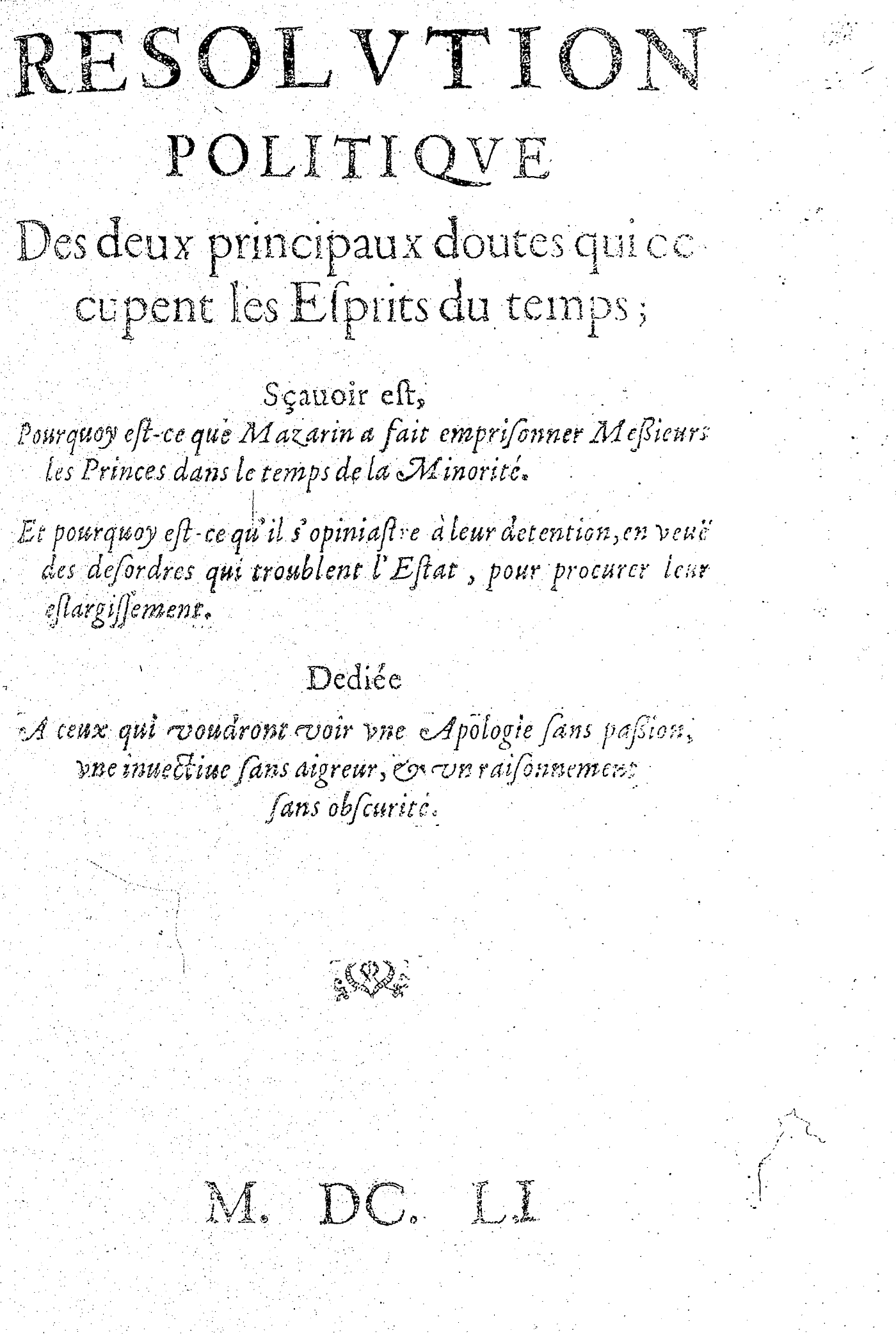 RESOLVTION POLITIQVE Des deux principaux doutes qui occupent les Esprits du temps ; Sçauoir est, Et pourquoy est-ce qu’il s’opiniastre à leur detention, en veuë des desordres qui troublent l’Estat, pour procurer leur