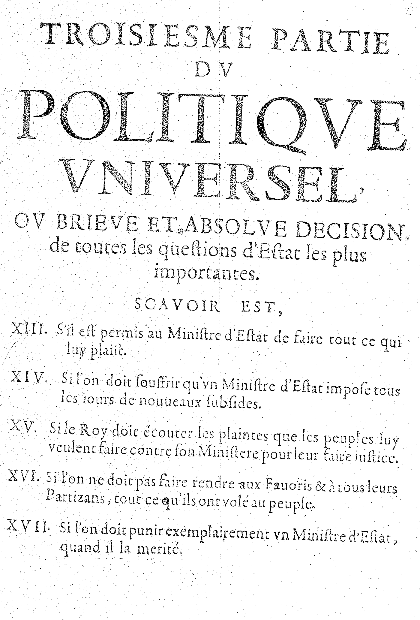 TROISIESME PARTIE DV POLITIQVE VNIVERSEL, OV BRIEVE ET ABSOLVE DECISION, de toutes les questions d’Estat les plus importantes. SCAVOIR EST, XIII. S’il est permis au Ministre d’Estat de faire tout ce qui luy plaist. XIV. Si l’on doit souffrir qu’vn Ministre d’Estat impose tous les iours de nouueaux subsides. XV. Si le Roy doit écouter les plaintes que les peuples luy veulent faire contre son Ministere pour leur faire iustice. XVI. Si l’on ne doit pas faire rendre aux Fauoris & à tous leurs Partizans, tout ce qu’ils ont volé au peuple. XVII. Si l’on doit punir exemplairement vn Ministre d’Estat, quand il la merité.
