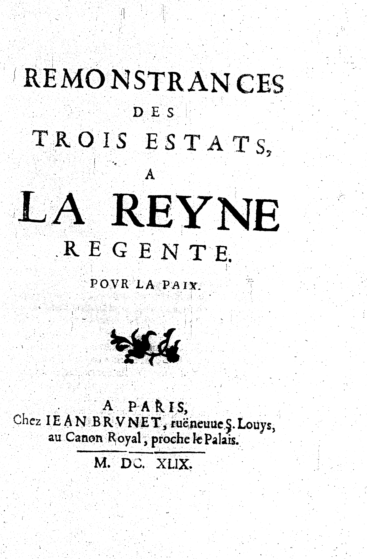 REMONSTRANCES DES TROIS ESTATS, A LA REYNE REGENTE. POVR LA PAIX.