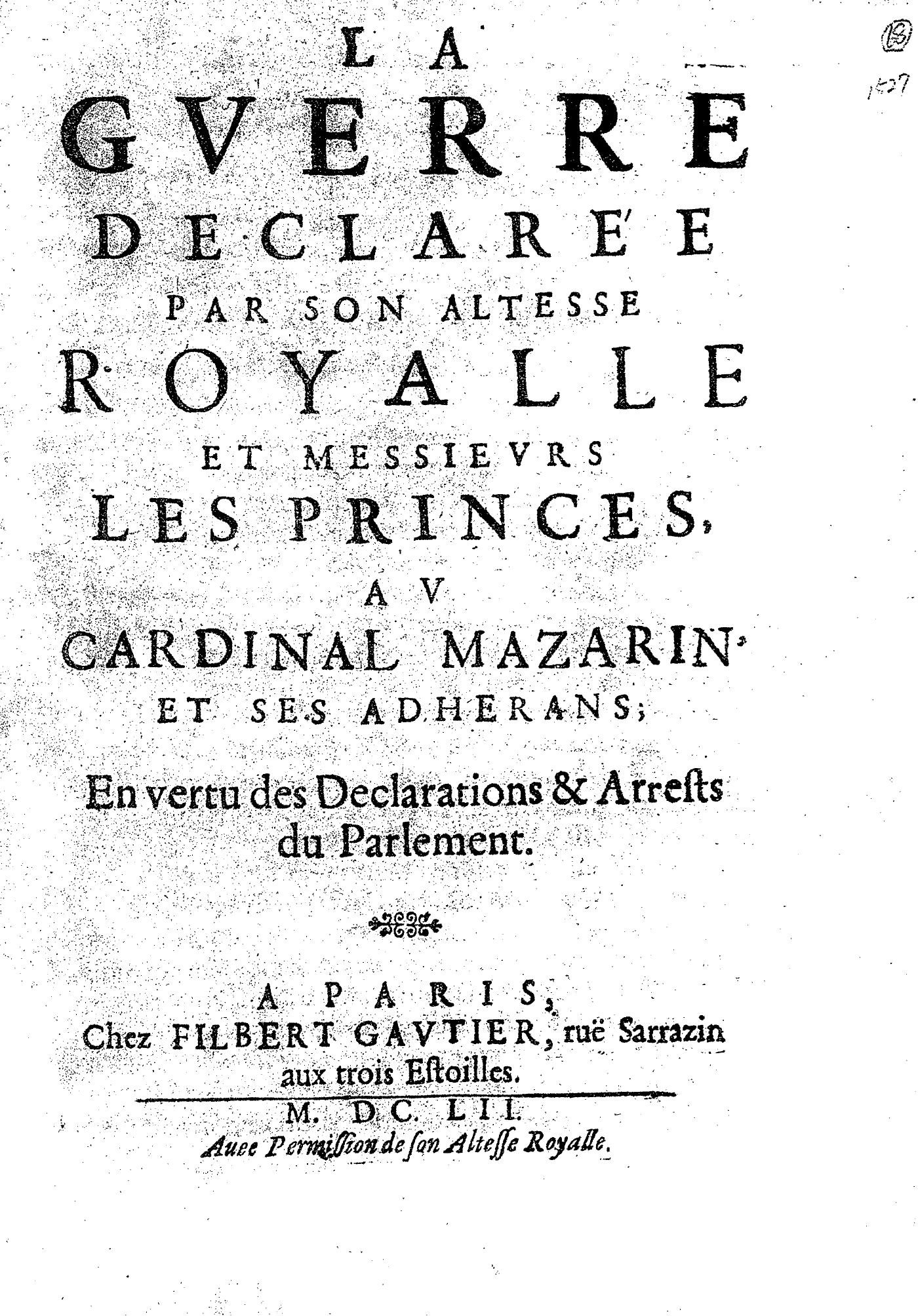 LA GVERRE DECLARÉE PAR SON ALTESSE ROYALLE ET MESSIEVRS LES PRINCES, AV CARDINAL MAZARIN, ET SES ADHERANS ; En vertu des Declarations & Arrests du Parlement.