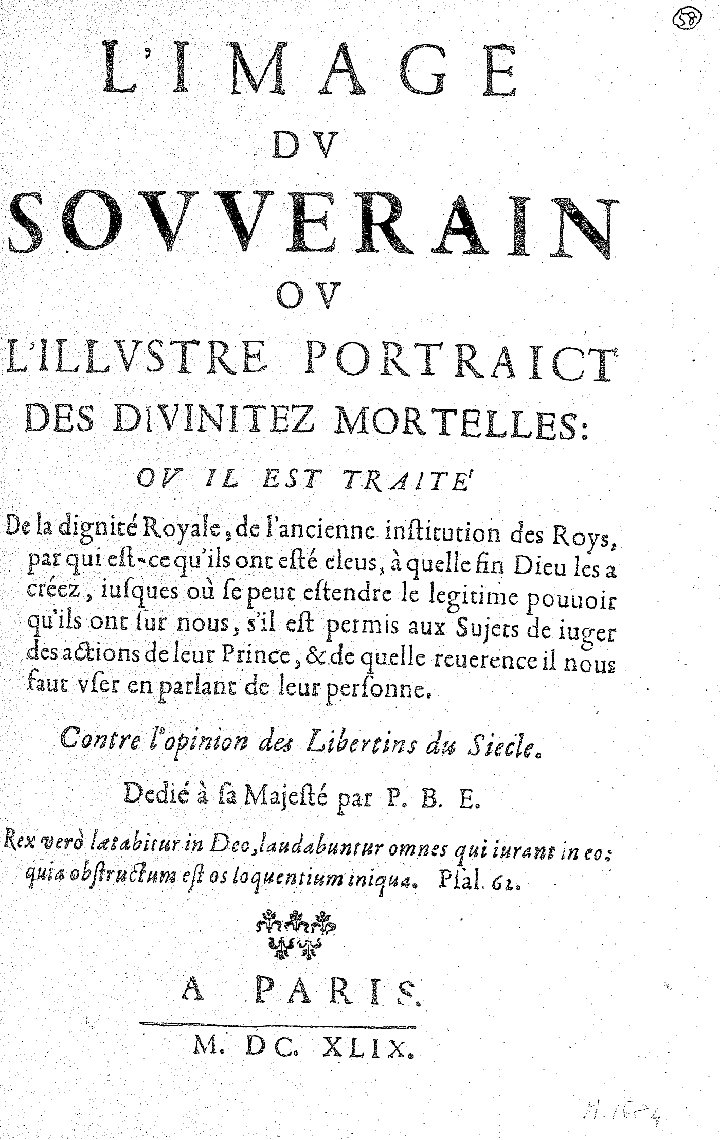 L’IMAGE DV SOVVERAIN OV L’ILLVSTRE PORTRAICT DES DIVINITEZ MORTELLES : OV IL EST TRAITÉ Contre l’opinion des Libertins du Siecle. Dedié à sa Majesté par P. B. E. Rex verò lætabitur in Dec, laudabuntur omnes qui iurant in eo ; quia obstructum est os loquentium iniqua.