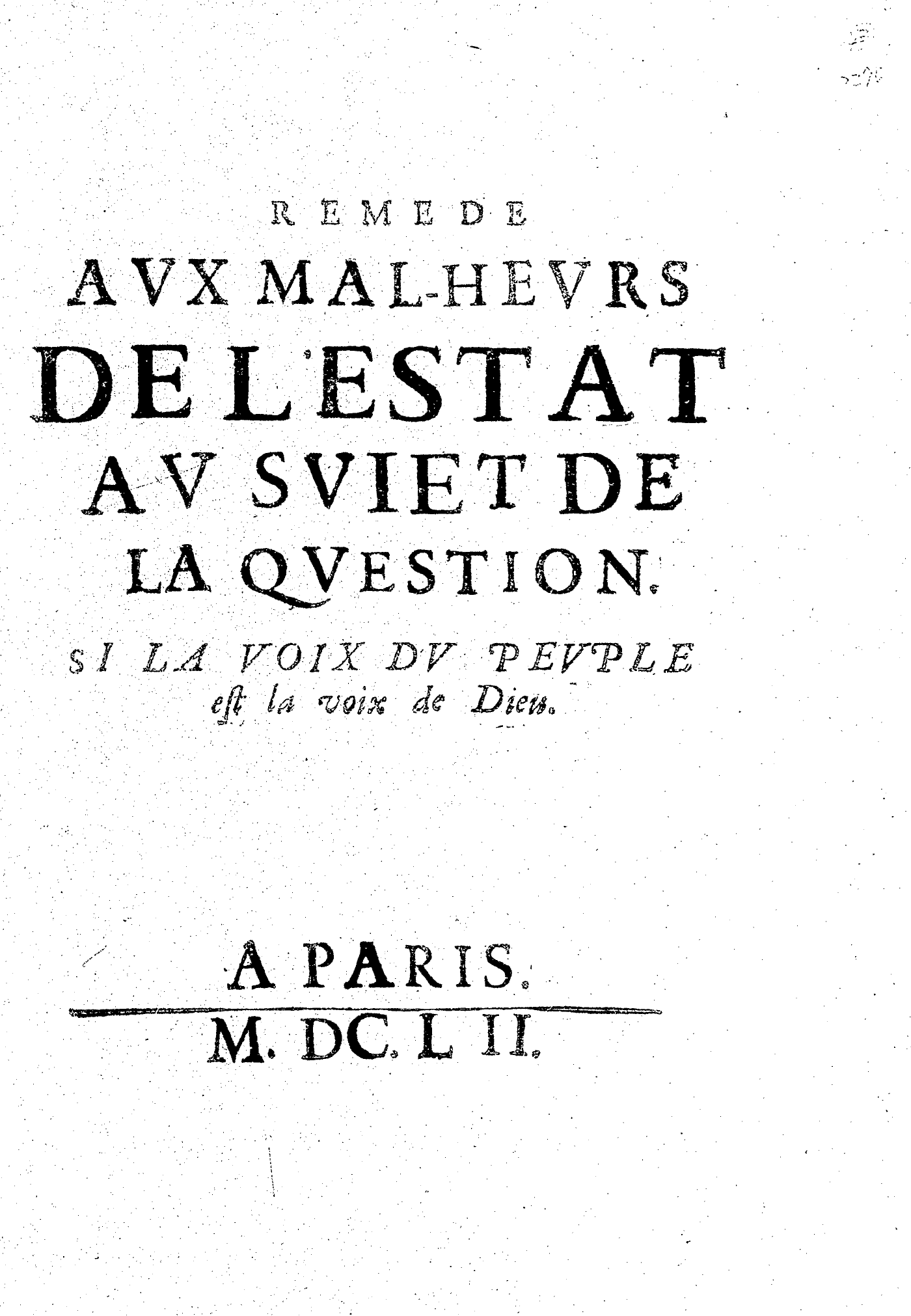 REMEDE AVX MAL-HEVRS DE L’ESTAT AV SVIET DE LA QVESTION. SI LA VOIX DV PEVPLE est la voix de Dieu.
