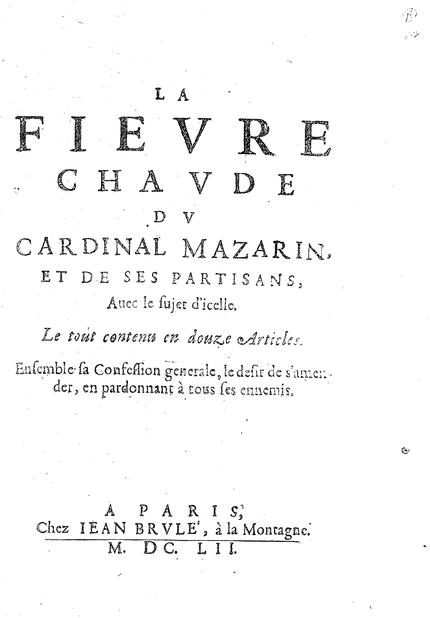 LA FIEVRE CHAVDE DV CARDINAL MAZARIN, ET DE SES PARTISANS, Auec le sujet d’icelle. Le tout contenu en douze Articles. Ensemble sa Confession generale, le desir de s’amender, en pardonnant à tous ses ennemis.