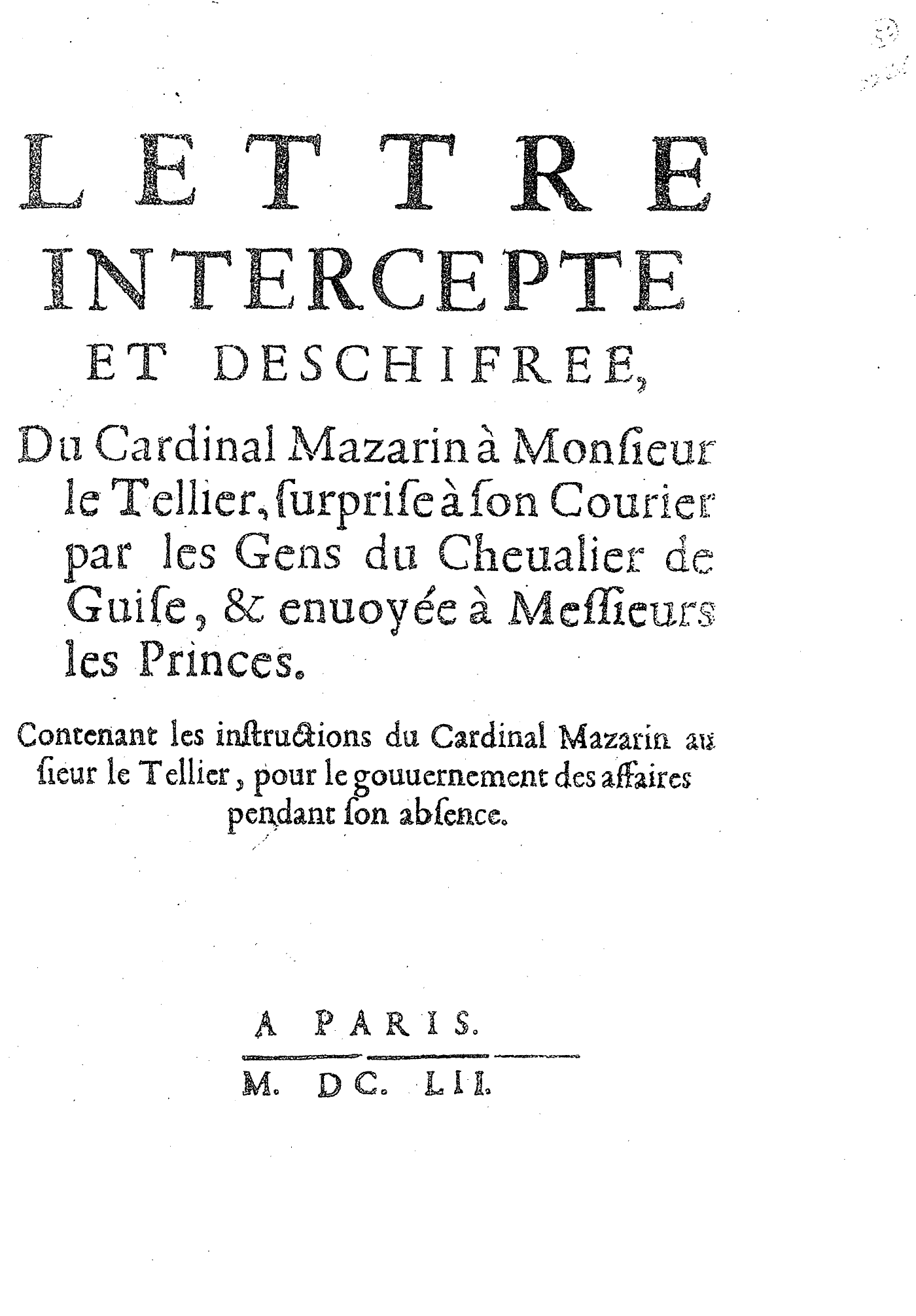 LETTRE INTERCEPTE ET DESCHIFREE, Du Cardinal Mazarin à Monsieur le Tellier, surprise à son Courier par les Gens du Cheualier de Guise, & enuoyée à Messieurs les Princes. Contenant les instructions du Cardinal Mazarin au sieur le Tellier, pour le gouuernement des affaires pendant son absence.