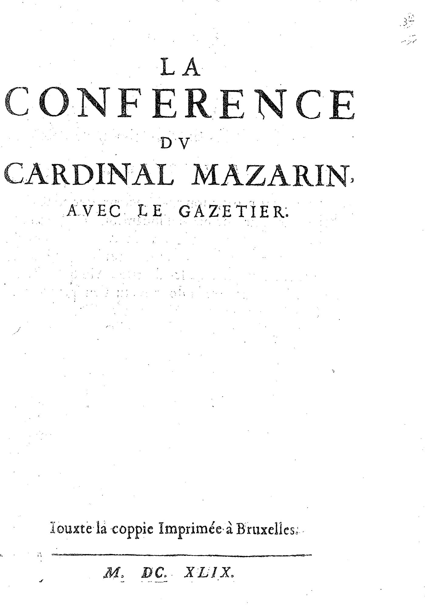 LA CONFERENCE DV CARDINAL MAZARIN, AVEC LE GAZETIER. Iouxte la coppie Imprimée à Bruxelles.
