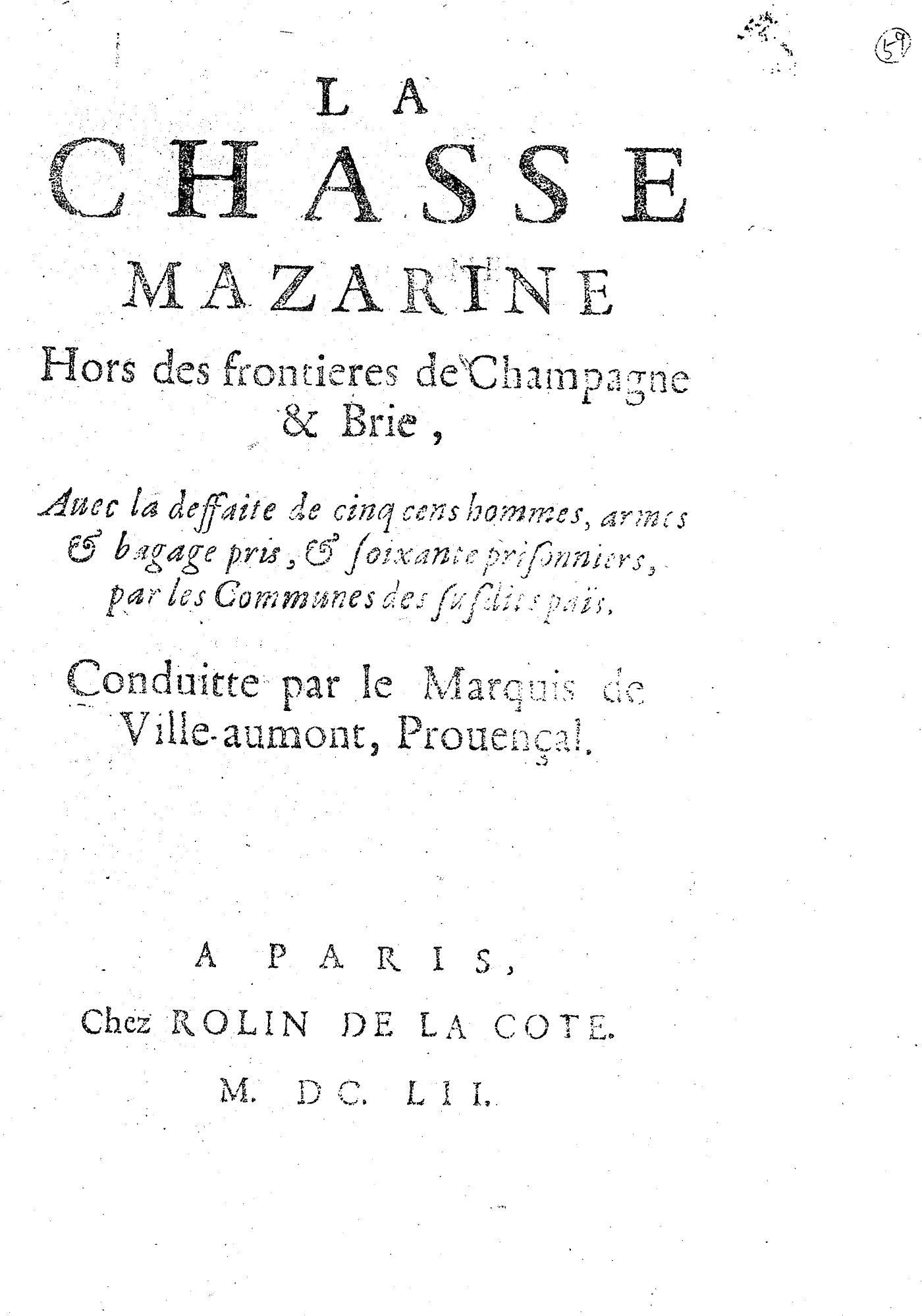 LA CHASSE MAZARINE Hors des frontieres de Champagne & Brie, Auec la deffaite de cinq cens hommes, armes & bagage pris, & soixante prisonniers, par les Communes des susdits païs. Conduitte par le Marquis de Ville-aumont, Prouençal.