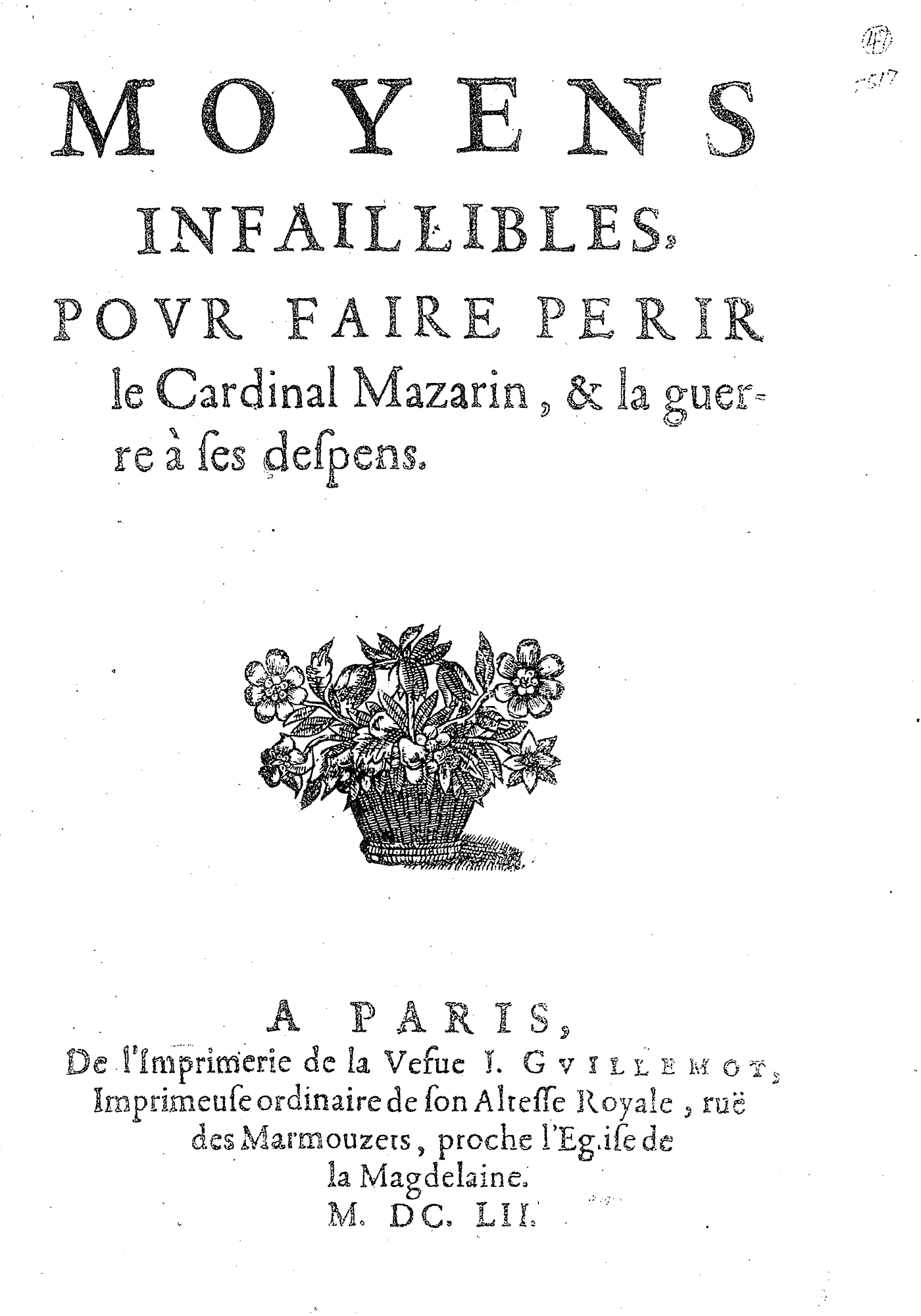 MOYENS INFAILLIBLES, POVR FAIRE PERIR le Cardinal Mazarin, & la guerre à ses despens.