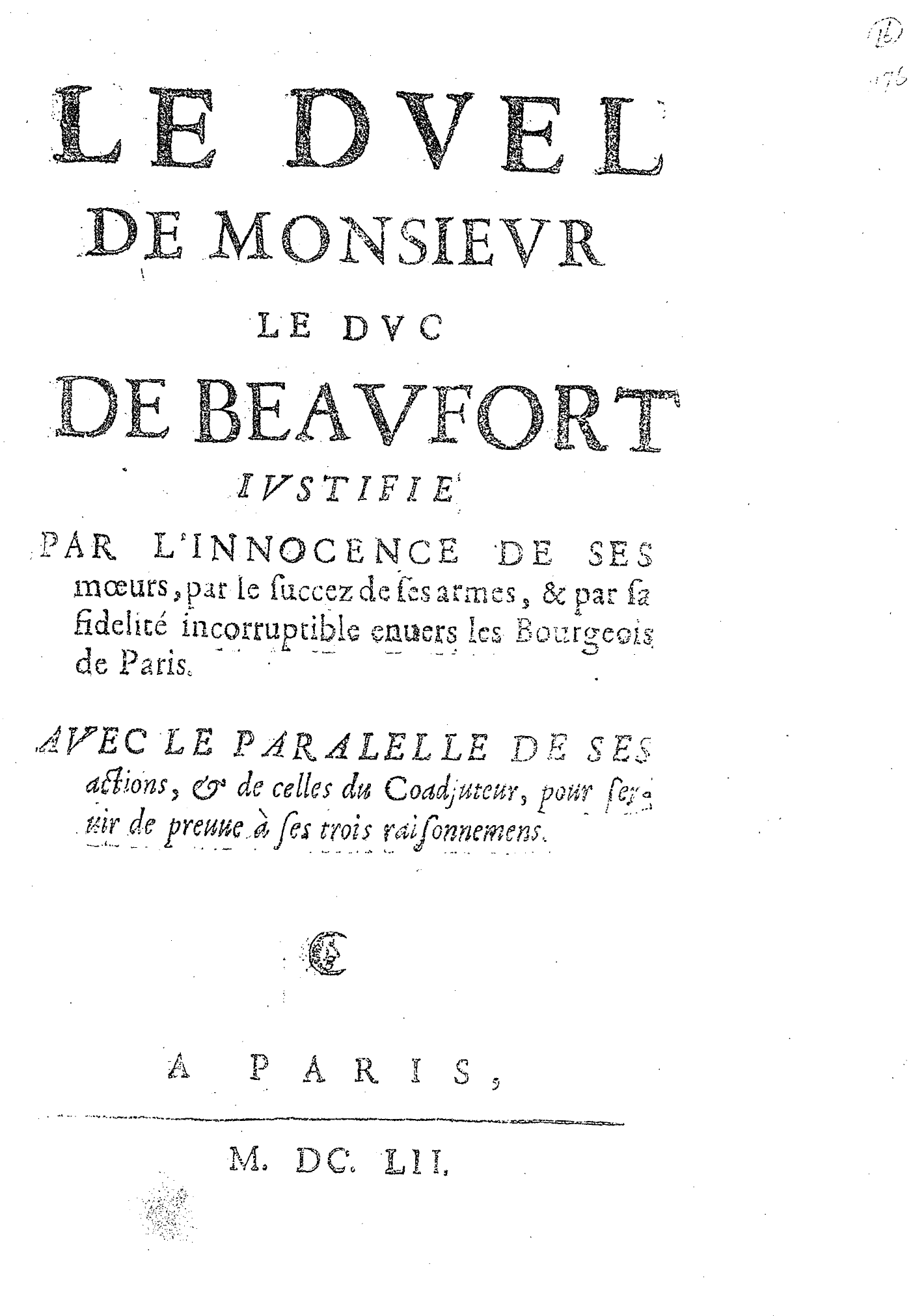 LE DVEL DE MONSIEVR LE DVC DE BEAVFORT IVSTIFIÉ PAR L’INNOCENCE DE SES mœurs, par le succez de ses armes, & par sa fidelité incorruptible enuers les Bourgeois de Paris. AVEC LE PARALELLE DE SES actions, & de celles du Coadjuteur, pour seruir de preuue à ses trois raisonnemens.