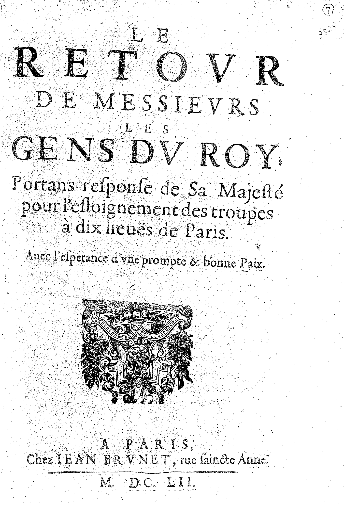 LE RETOVR DE MESSIEVRS LES GENS DV ROY, Portans response de Sa Majesté pour l’esloignement des troupes à dix lieuës de Paris. Auec l’esperance d’vne prompte & bonne Paix.