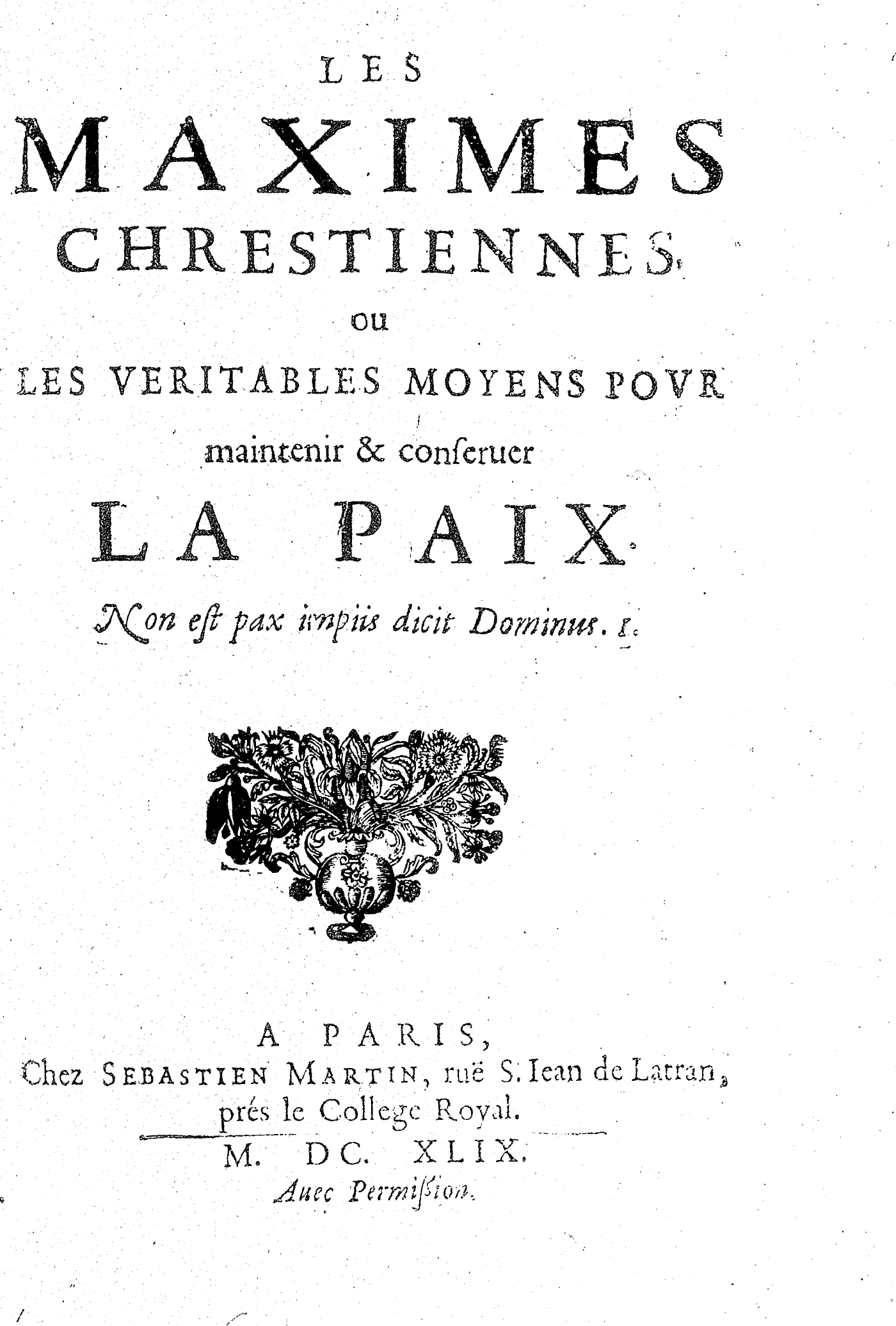 LES MAXIMES CHRESTIENNES, ou LES VERITABLES MOYENS POVR maintenir & conseruer LA PAIX. Non est pax impiis dicit Dominus. I.